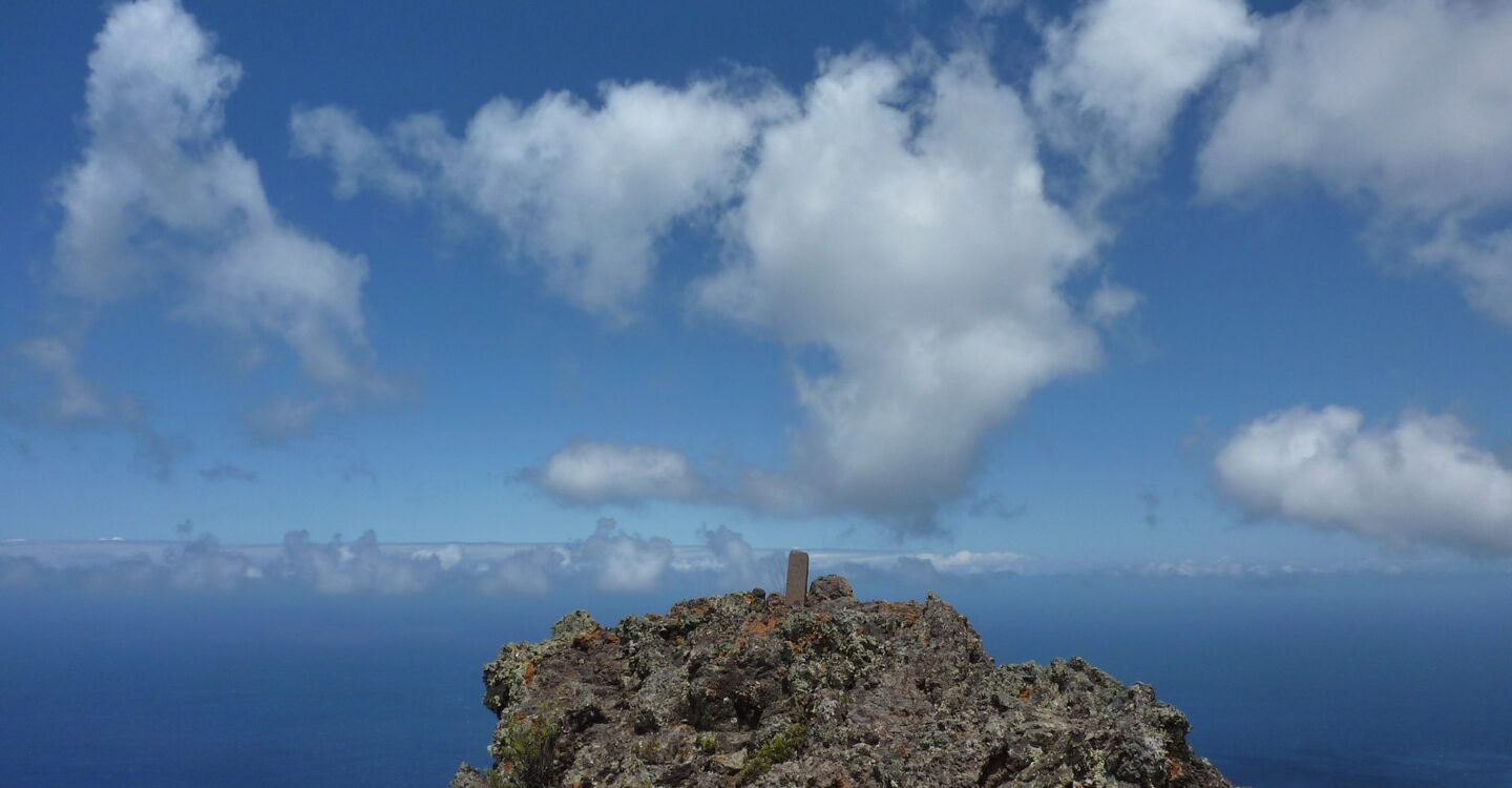 Anschließend queren wir unterhalb des Gipfels links in südliche Richtung - hier sind vereinzelt Steinmännchen aufgestellt -, um dann über den Grat des Berges rechts bis zum Gipfel des (05) Tejeleche (618 m) aufzusteigen. An einigen Stellen muss man die Hände zu Hilfe nehmen. Oben auf dem Gipfel sitzt man ziemlich exponiert, hat dafür aber einen gigantischen 360-Grad-Panoramarundblick. Nachdem wir diesen ausgiebig genossen haben, gehen wir auf dem uns bekannten Hinweg zurück.
