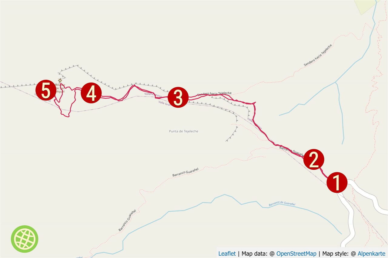 Zwischen dem Barranco del Mono, das in das Tal von Alojera mündet, und dem Barranco del Guarane, das in das Tal von Taguluche fließt, befindet sich ein wild zerklüftetes, von der Erosion geformtes Bergmassiv - mit dem 619 m hohen Tejeleche als höchstem Punkt. Der insgesamt nur kurze Anstieg zum Gipfel erfordert aber absolute Schwindelfreiheit und Trittsicherheit. Von der exponierten Spitze des Berges fallen die Felswände senkrecht bis zum Meer ab – Adrenalinausschüttung garantiert.