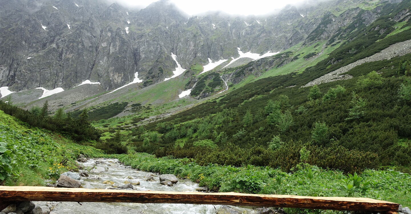 Nachdem wir zwei Bachläufe überquert haben, steigen wir dann auf einem mit Felsen verlegten Pfad talwärts in das 8 km lange 04 Javorová Dolina (1533). Durch ein ursprüngliches und gottverlassenes Tal gelangen wir zu einem romantisch gelegenen See, rechts und links ragen majestätisch die Berggipfel in die Höhe. Auf einem halbierten Baumstamm wird der Bachlauf gequert. Wir gehen dann immer parallel zum Bachlauf und kommen an einer vereinzelten Hütte vorbei.