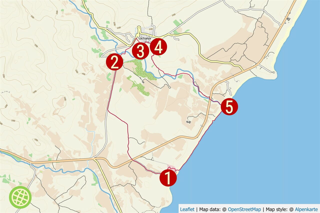 Auf dieser mittelschweren Wanderung gibt es nur zwei knifflige Stellen, die etwas Orientierungssinn voraussetzen. Art des Weges: 10 % weglos, 10 % Asphaltstraße, 40 % am Strand und 40 % auf einer Schotterpiste. Ausrüstungsempfehlung: Badesachen und Sonnenschutz. Einkehr: Ein absolutes Muss ist die Taverne Platanos in Lachania. Beste Jahreszeit für diese Tour: April bis Oktober. Sehenswert: In Lachania gibt es 60 m nordwestlich der St.-George-Kirche eine alte Ölpresse zu bewundern.