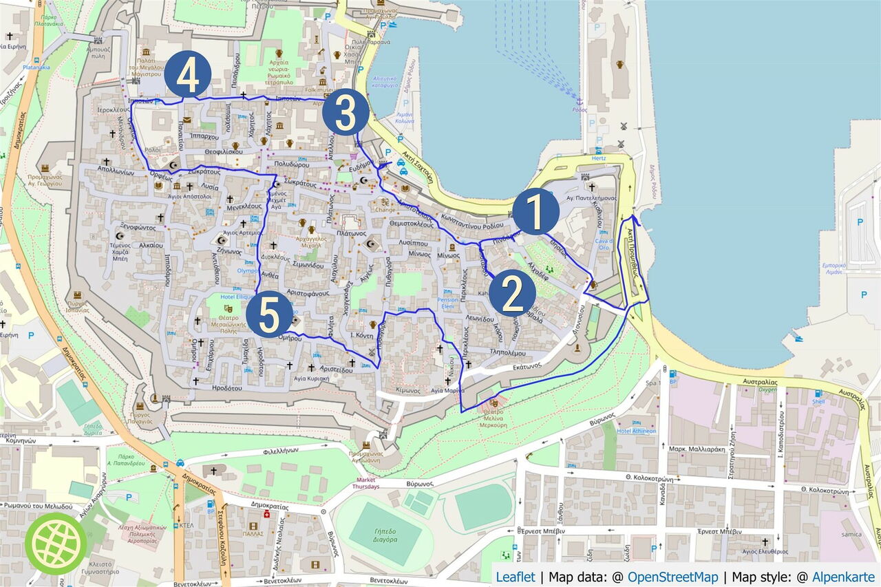 Mehrere Tage könnte man in der Altstadt verbringen und doch immer wieder Neues entdecken. 30 Gebäude und Plätze gelten als besonders sehenswert. Manch anderer Stadt würde eine einzige dieser Sehenswürdigkeiten genügen, um ihre Gäste zum Besuch des historischen Stadtkerns einzuladen. Die Altstadt von Rhodos ist ein riesiges Freilichtmuseum. So führt der Weg entlang der ältesten mittelalterlichen Straße Griechenlands sowie an der ältesten Taverne Griechenlands. Wer sich auf das Wesentliche konzentrieren möchte: Auf dieser nachfolgend beschriebenen Runde werden die BIG FIVE mit einem Rundspaziergang verbunden.