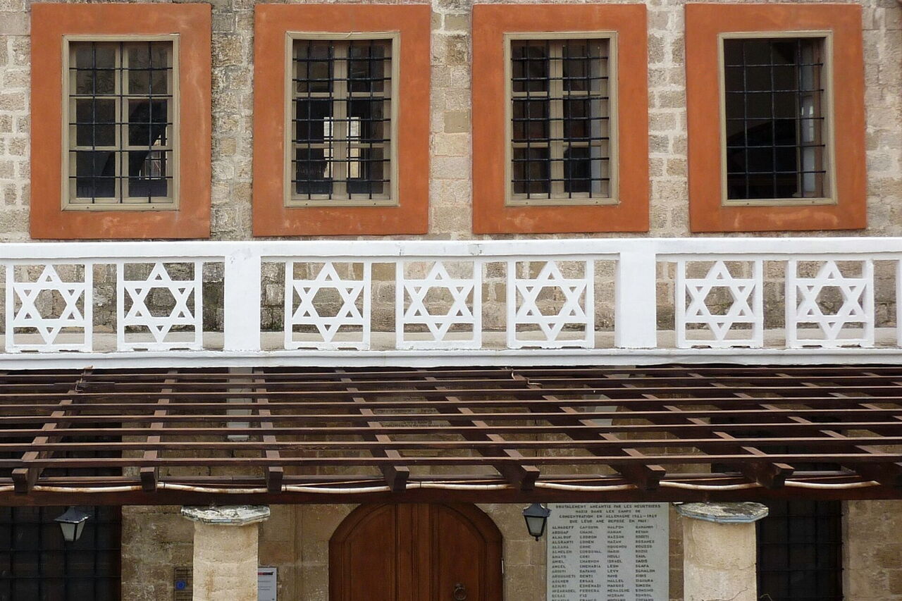 Wir setzen unseren eingeschlagenen Weg fort und gehen nach 60 m, noch vor den 3 Seepferdchen, links in die Einbahnstraße. Wir treffen auf die (02) Kahal-Kadosh-Shalom-Synagoge (11 m) – das älteste jüdische Gotteshaus Griechenlands. Die 1577 erbaute Synagoge bildete das Zentrum des Judenviertels von Rhodos, in dem 1930 etwa 4000 Menschen lebten. Wir gehen auf der Einbahnstraße zurück, links an den Seepferdchen vorbei und treffen auf einen großen Platz mit mächtigen Birkenfeigen. Dort befindet sich ein Gedenkstein an die jüdischen Kriegsopfer von 1944. Wir setzen den Weg weitere 140 m fort, lassen den Brunnen links liegen und gehen in die Einbahnstraße, vorbei an zahllosen Läden, bis rechts der Blick durch das Marientor zum alten Hafen freigegeben wird.
