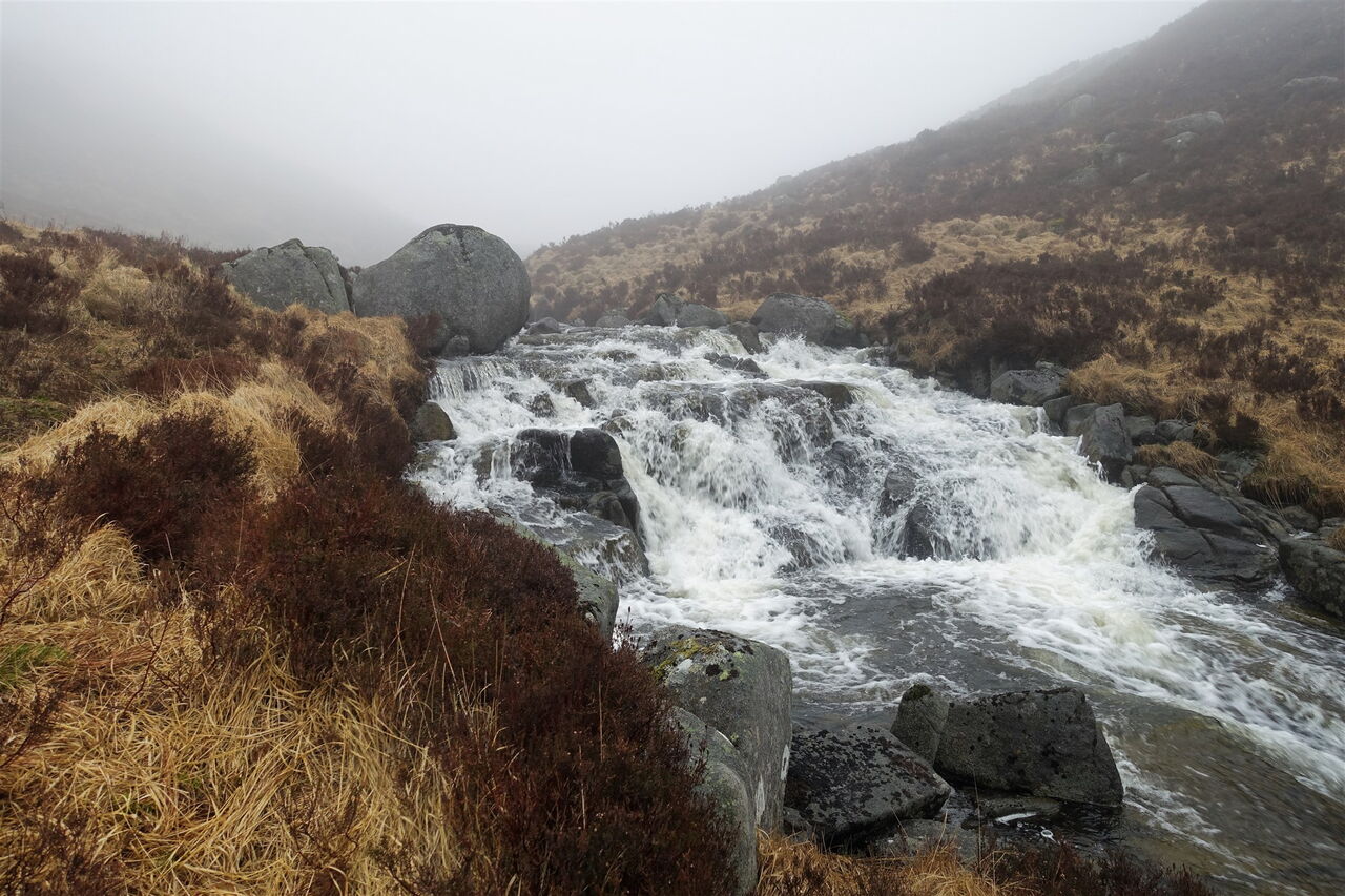 Wir gelangen wieder auf den Hauptweg beim Parkplatz und folgen nun der für Autos gesperrten Straße bergab. Mit Blick auf den Loch Trool überqueren wir eine Brücke und gehen links an dem Privatgrundstück vorbei, bis wir dem linken Wegweiser Richtung Gairland Burn und Loch Valley durch ein Gatter folgen. Der Pfad steigt kontinuierlich an, während wir mehrere Gatter passieren. Das tiefe Grollen des Flusslaufes 02 Gairland Burn (259 m) ist unser Wegbegleiter. Der Weg ist extrem sumpfig, führt aber durch eine atemberaubende Naturlandschaft.