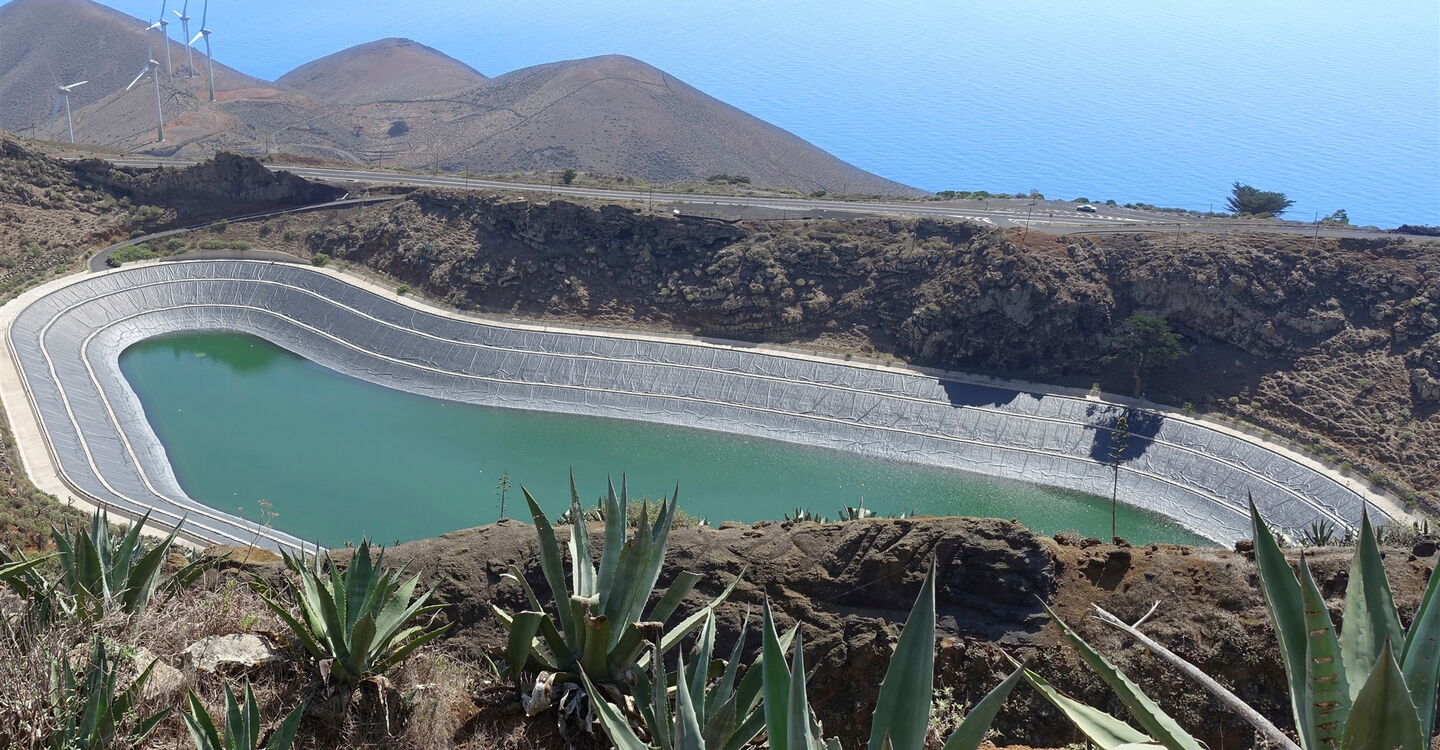 Ab hier gehen wir auf dem Fernwanderweg, der die Insel auf ihrer gesamten Länge durchquert. Fortan ist der Pfad gut markiert und breit ausgebaut, sodass es beinahe unmöglich ist, sich zu verlaufen. Wir queren zweimal die Straße und erreichen die (05) La Caldereta de Tinor (803 m), den Kessel des ältesten Vulkans der Insel. Heutzutage beherbergt die relativ erdbebensichere Caldera das obere Wasserreservoir der Wind-Wasserkraftanlage. Ein letztes Mal queren wir die Hauptstraße und gehen links hinter der Leitplanke auf dem gepflasterten Weg nun direkt nach Valverde herunter.