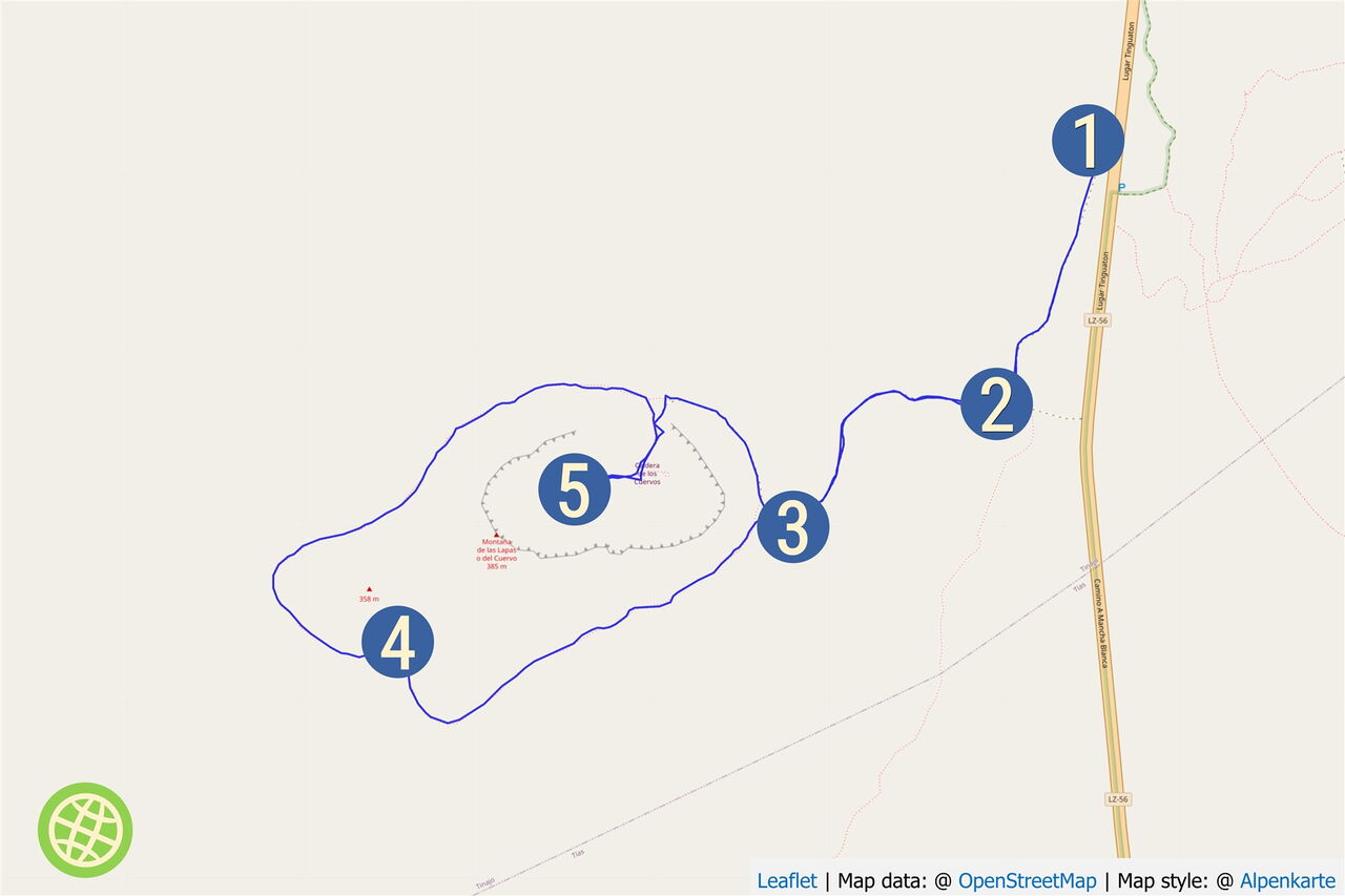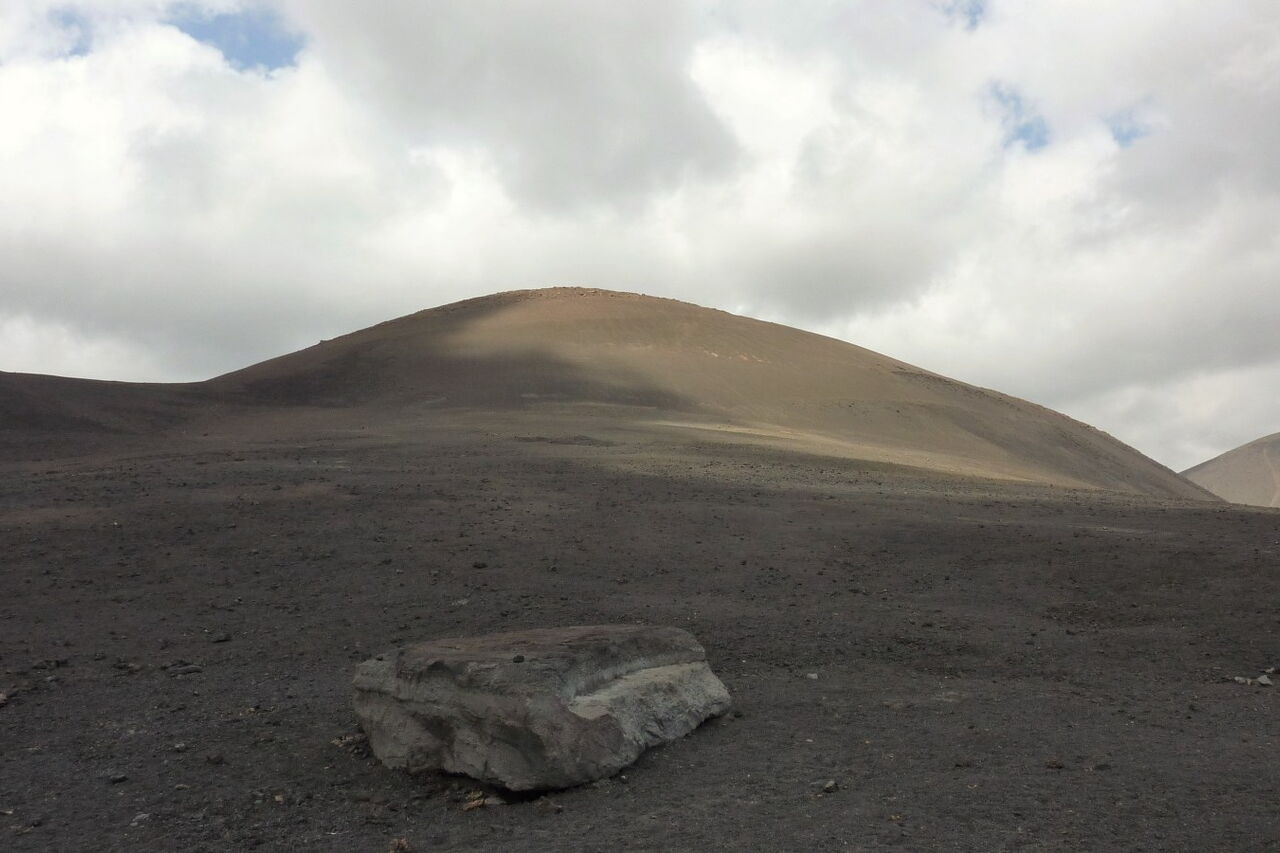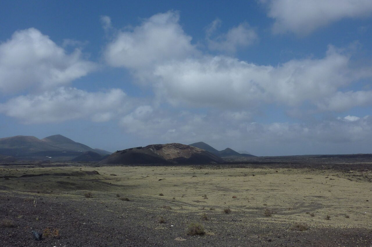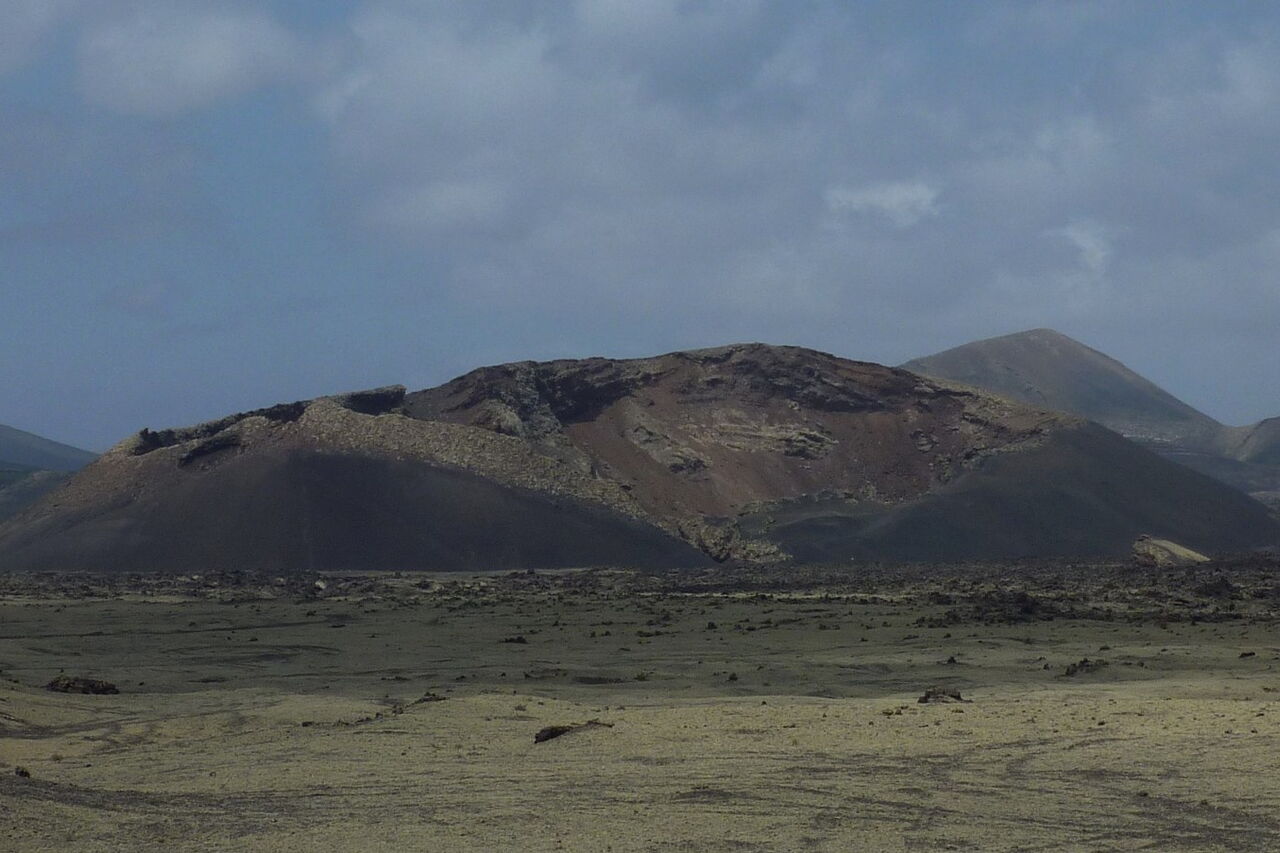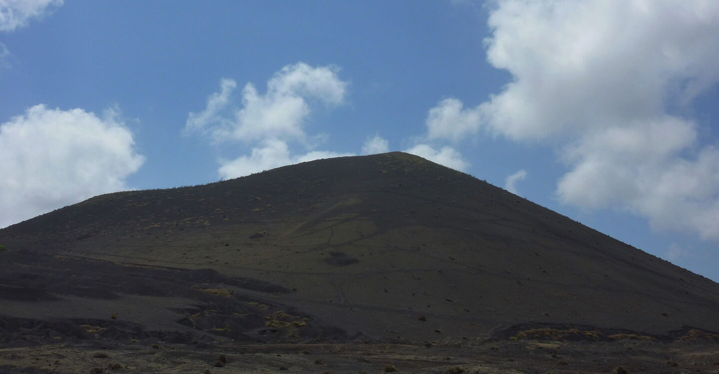 Zunächst gehen wir ein Stück parallel zur (02) LZ-56 (336 m). Wir befinden uns mittig zwischen der Montaña Negra (518 m) - der Vulkan links von uns - und der Caldera de Los Cuervos. Bei näherer Betrachtung könnte man denken, dass die Montaña Negra ebenfalls von 1730-1736 aktiv gewesen ist. Weit gefehlt - da der Vulkan in unmittelbarer Nähe der Vulkanausbrüche stand, wurde er nur von 3-5 m Vulkanasche begraben. Der Vulkan selber stammt aus der früheren Entstehungsgeschichte von Lanzarote.