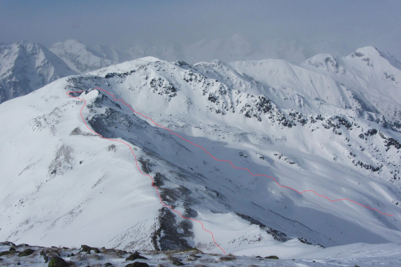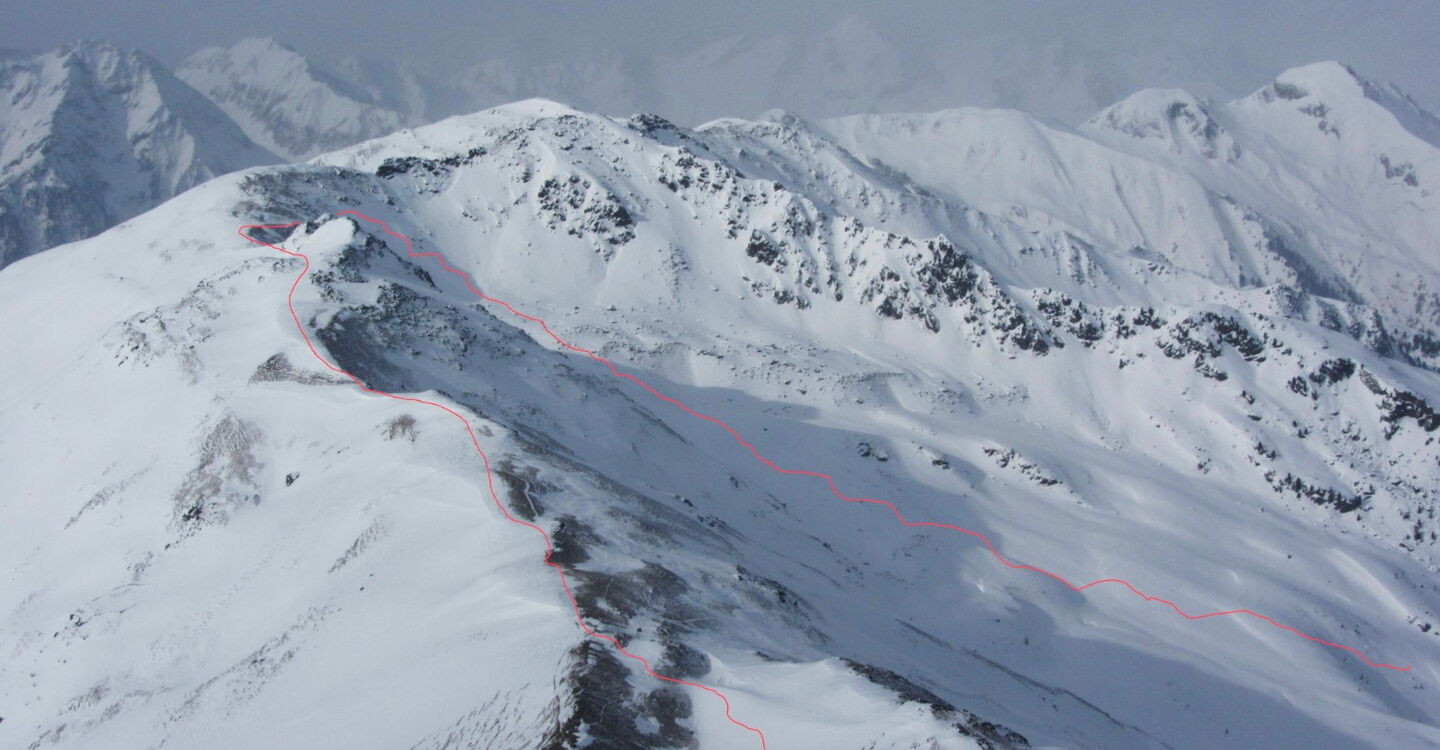 Beim Mühlwalder Jöchl geht es auf Fellen auf dem Kellerbauer Höhenweg, bis wir vor dem Gornerberg rechts ins weite Tal abfahren. Wir fahren ca. 1,6 km, bis es flacher wird.