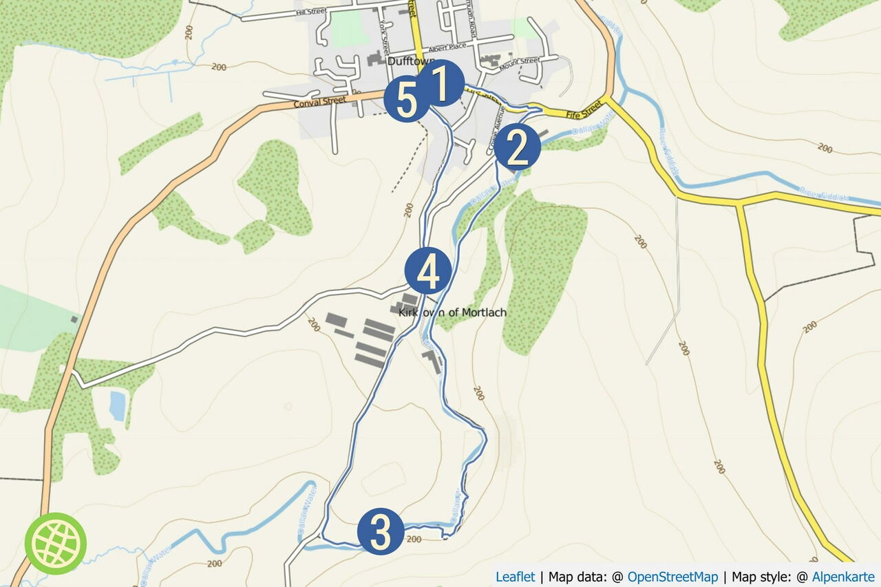 Einfacher Spaziergang für die ganze Familie. Art des Weges: 20 % Straße, 30 % Piste und 30 % Pfad. Zusatzausrüstung: Keine. Einkehr: Keine auf der Wanderung; am Ausgangspunkt der Wanderung das Stuart Arms Bar & Restaurant. Beste Wanderzeit: Ganzjährig. Sehenswert Region: Balvenie Castle, Entfernung 1,5 km, Geokoordinaten 57.444967 -3.128133.