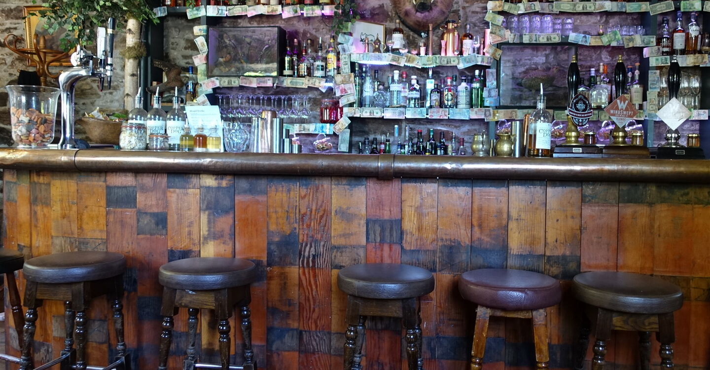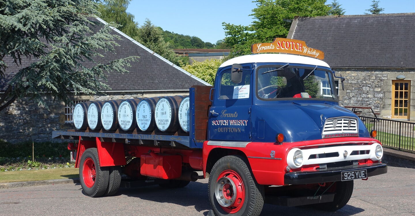 Beim großen Parkplatz an der Glenfiddich-Whiskybrennerei gehen wir bis an die Hauptstraße zurück und dort einige Meter links bis zur Bushaltestelle mit einer kupfernen Brennblase, die zur Destillation verwendet wird. Nach der Busfahrt erreichen wir die Ortschaft Aberlour. Wenn wir nicht zu früh aussteigen, sind wir bei dem großen Platz mit der dahinter liegenden Kirche. Direkt hinter dem Coop gehen wir links in die Queens Road und biegen bei der nächsten Möglichkeit rechts ab. Wir gehen am Ende der Straße bis an den Bach herunter, rechts bis zur Straße vor, links über die Brücke und abermals links bis zur 1826 gegründeten 01 Aberlour Distillery (95 m). Das Besucherzentrum befindet sich in einem urigen Steinhaus unter einer riesigen Norfolktanne.