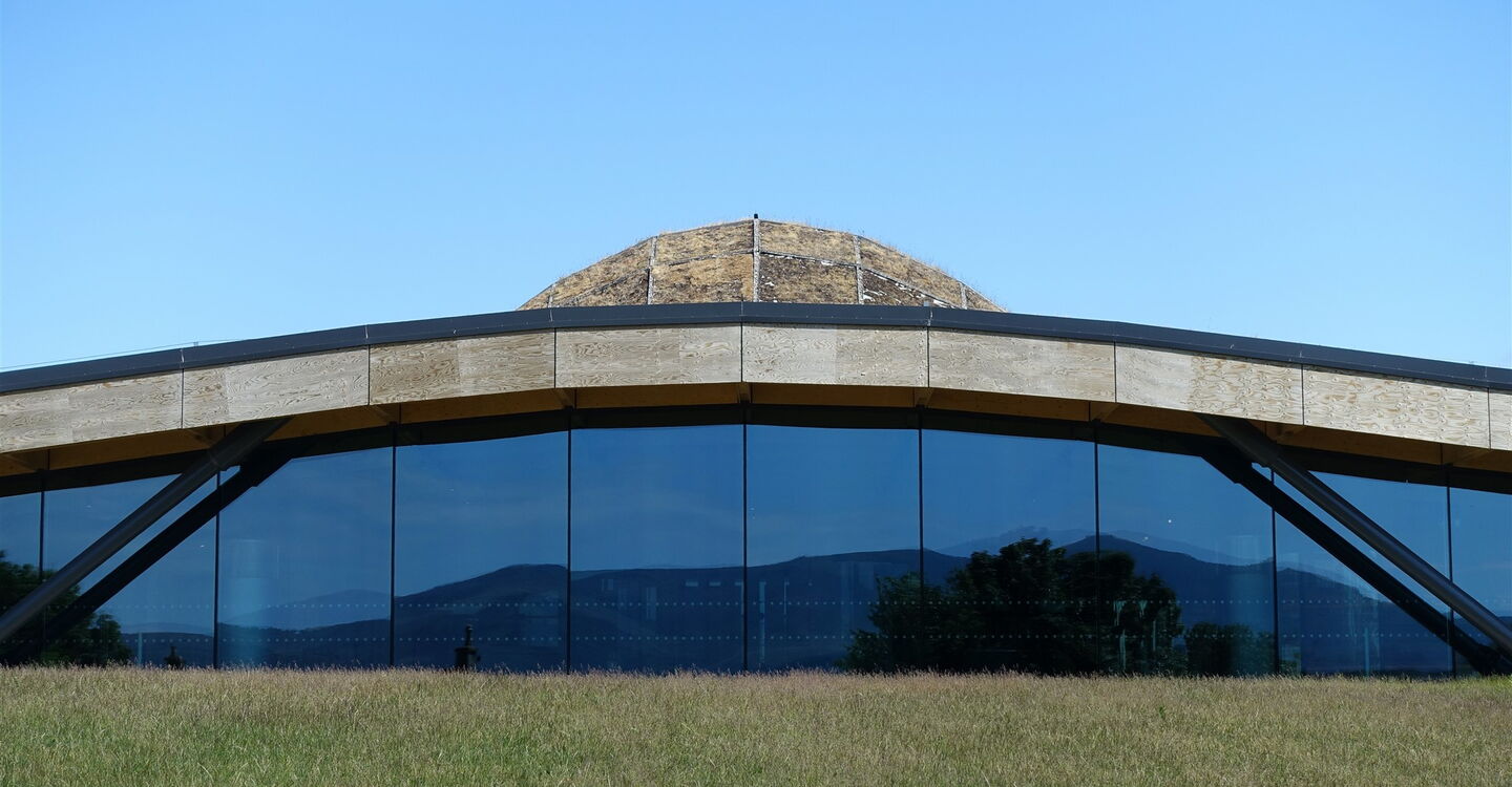 An der Hauptstraße gehen wir zurück über die Brücke, queren die Straße nach links, gehen hinter dem Friedhof rechts, an der darauffolgenden Holzbrücke rechts und am Parkplatz links über die 1900 erbaute Victoria-Metallbrücke. Es wurden viele Brücken dieses Typs gebaut, aber keine hat eine Spannweite von 87 m wie diese hier. Wir wandern flussabwärts entlang des Flusses Spey, bis die Piste die Uferpromenade verlässt, um einen kleinen Bachlauf zu queren. Von dort an gehen wir links bergauf. Bei den alten Gebäuden der Brennerei gehen wir vor den verschließbaren Metallschranken rechts über das alte Gelände der Whiskybrennerei 02 The Macallan (122 m) – und das darf man, der Autor hat das vorher recherchiert. Am nachfolgenden Kreisverkehr gehen wir halb rechts, links oberhalb erblicken wir bereits die riesigen Glasflächen der neuen Produktionsstätte, bevor wir links über einen Fußweg zu dem futuristisch anmutenden Besucherzentrum gelangen, wo über 800 Flaschen Whisky 10 m hoch gestapelt sind. Fakten: 4 Jahre Planung, 6 Jahre Bauphase, Einweihung im Mai 2018, die modernste aller Whiskybrennereien, 360.000 Holzplanken auf dem Gründach überspannen die 120 m lange Brennerei. Hier wurde geprotzt, das Geschäft scheint gut zu laufen.