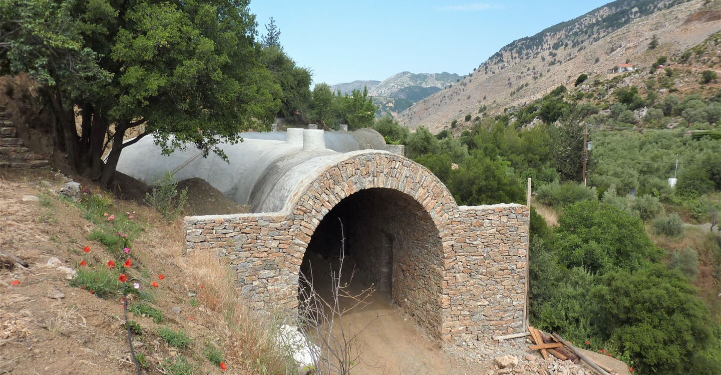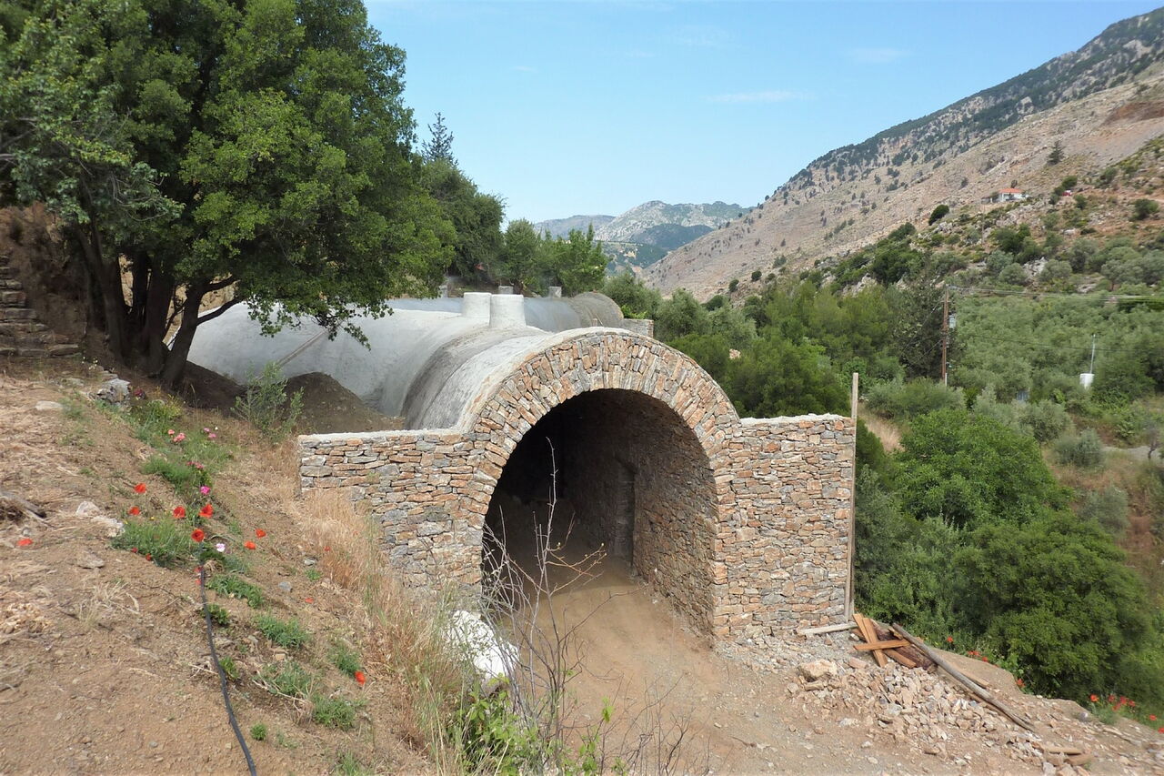 Nach 1,3 km verlassen wir die Hauptstraße nach halb links, laufen durch eine kleine Schlucht und erreichen die ersten Häuser des Dorfes Vorizia. An der Hauptstraße gehen wir links, vorbei an Gedenktafeln aus dem Zweiten Weltkrieg. Die Deutschen hatten dieses Dorf fast komplett vernichtet – lange dauerte es, bis man sich davon erholte. Heutzutage hat die Dorfgemeinschaft die meisten Bienenvölker auf Kreta. Auf einer Einsattelung erreichen wir die links oberhalb liegenden Tunnelröhren eines 02 botanischen Gartens (649 m) und 20 Übernachtungsmöglichkeiten (ab 2018). In der Taverne Paradosi reicht eine alte Dame Gerichte. Wir wandern durch die Ortschaft Kamares, bekannt für die auf 1542 m Höhe liegende Kamares-Höhle, in der eine Fruchtbarkeitsgöttin verehrt wurde.