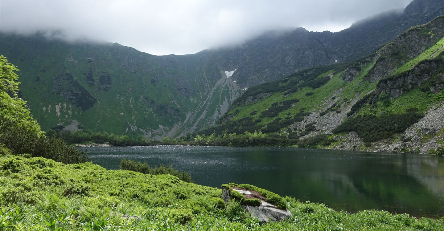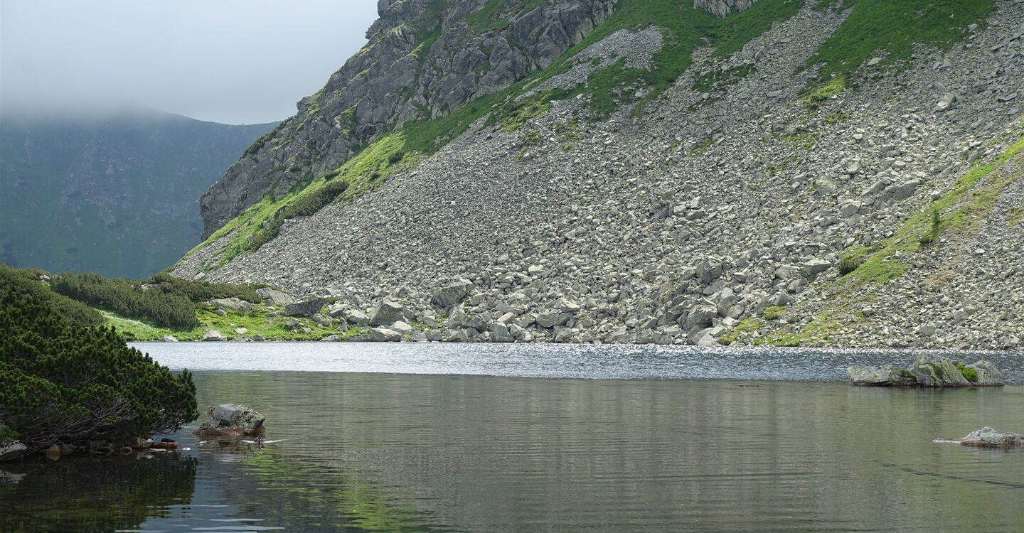 Auf einem angelegten Pfad steigen wir weiter auf und kommen am dritten, vierten und letzten der 04 Roháče plesá (1683 m) vorbei. Wir haben den höchsten Punkt der Tour erreicht, von nun an geht es steil und in engen Kehren auf einem blau ausgezeichneten Wanderweg talwärts. Wir ignorieren den linken Abzweiger Richtung Žiarska Chata (siehe Touren 31 und 32).
