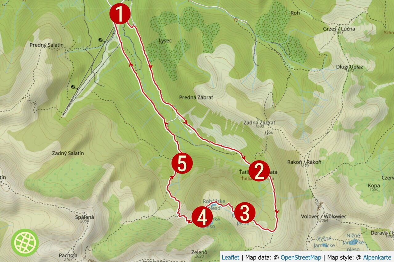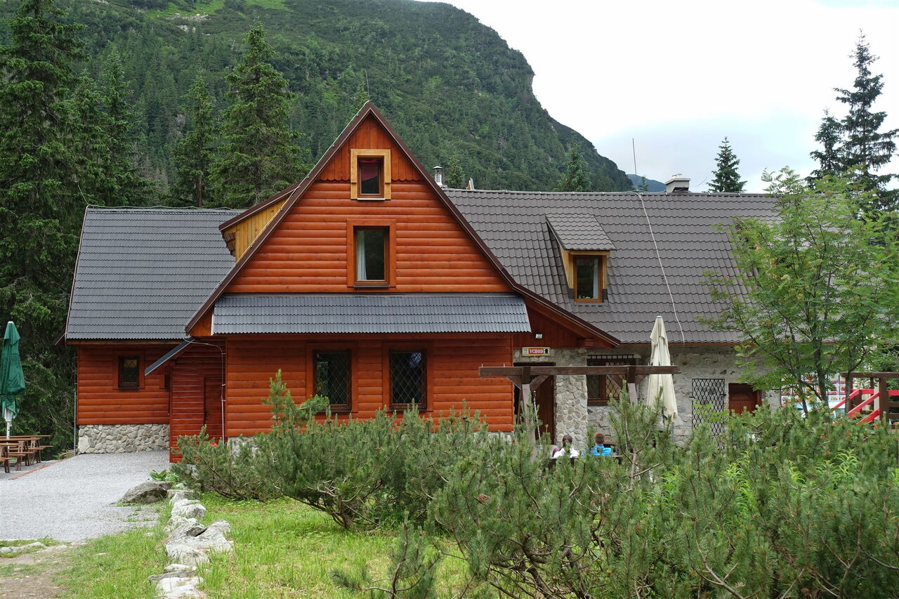 Den darauffolgenden rechten Abzweiger lassen wir aus und gehen geradeaus weiter. Wir erreichen die idyllisch am Ťatliakova-See gelegene 02 Ťatliakova Chata (1316 m). Sie ist in der Zeit vom 15. Juni bis 30. Oktober bewirtschaftet. Ein geräumiges Esszimmer mit Kamin lädt zum Verweilen ein. Noch vor der Hütte zweigt halb links der ausgezeichnete Pfad Richtung Roháče plesá ab. Dieser führt etwas oberhalb des ersten Sees entlang. Links oberhalb (Richtung Osten) auf dem Bergrücken befindet sich die Tour 75 – im Grenzgebiet zwischen der Slowakei und Polen.
