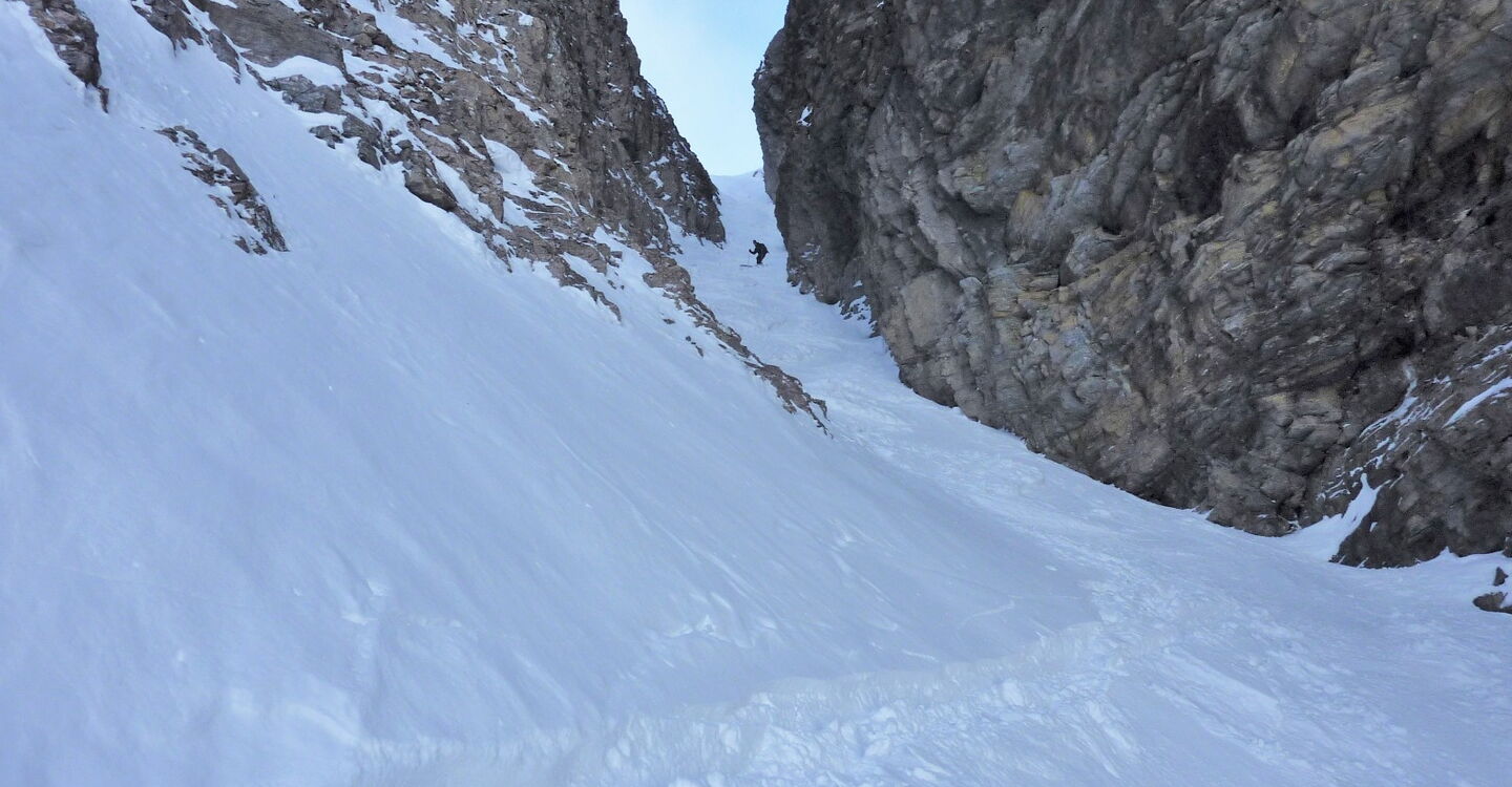 Wir fahren ins andere Tal hinunter. Nach ca. 800 m gilt es Ausschau zu halten nach dem Einstieg in die 500 m lange und steile Scharte.