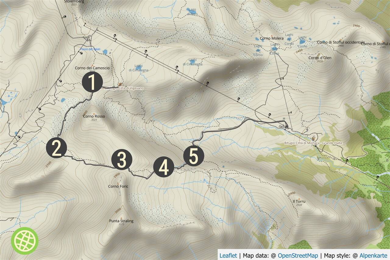 Von der Bergstation der Seilbahn Nr. 30 Pianalunga Salati fahren wir zum Rifugio Città di Vigevano ab. Von dort geht es rechts 15 hm im Anstieg über den Passo Olen um zur Abfahrt zu kommen.