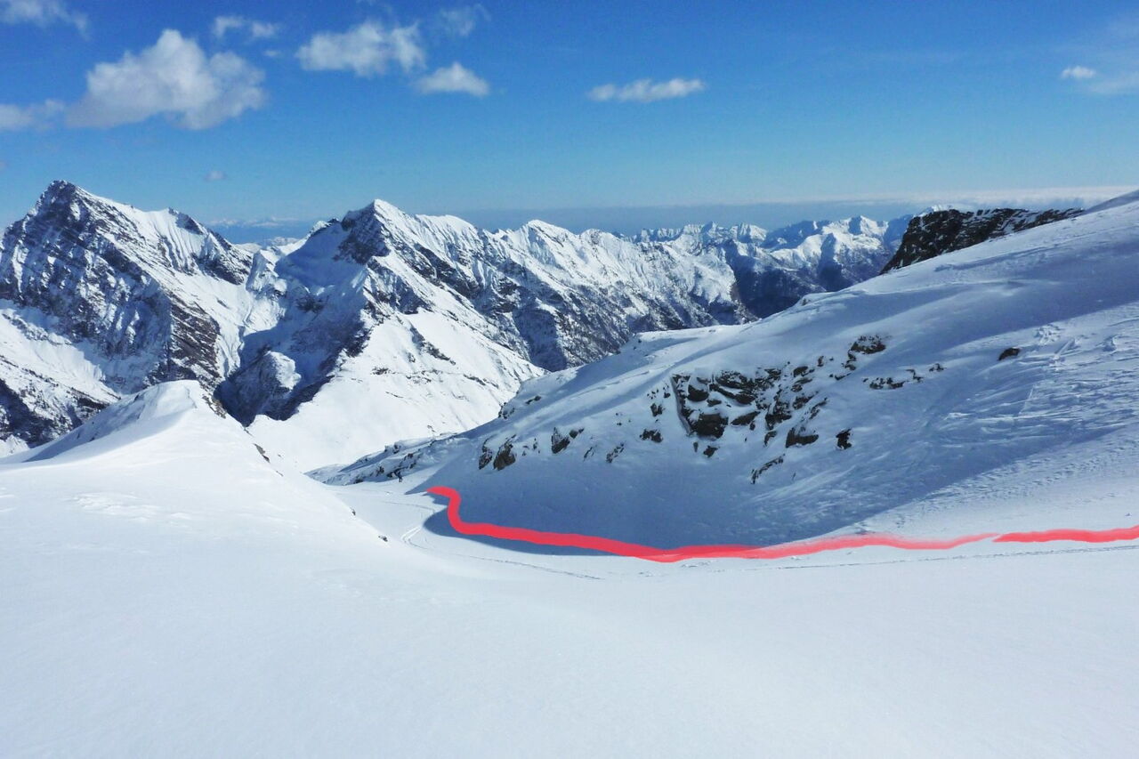 Der Einstieg zum Aufstieg ist nicht leicht zu finden. Sonst ist mithilfe des GPS-Tracks auf der Abfahrt die Orientierung einfach. Die Abfahrt führt über einen Südosthang. Folgende Ausrüstung wird empfohlen: Produkte für alpine Sicherheit im Schnee, Freerideski und Skitourenhelm. Es gibt keine Einkehr auf der Tour. Außer man nimmt vor oder nach der Tour eine Stärkung in dem Rifugio Città di Vigevano. Beste Jahreszeit: Januar bis Mitte März. Uns erwarten kurze Stücke mit bis zu 35° Hangneigung.
