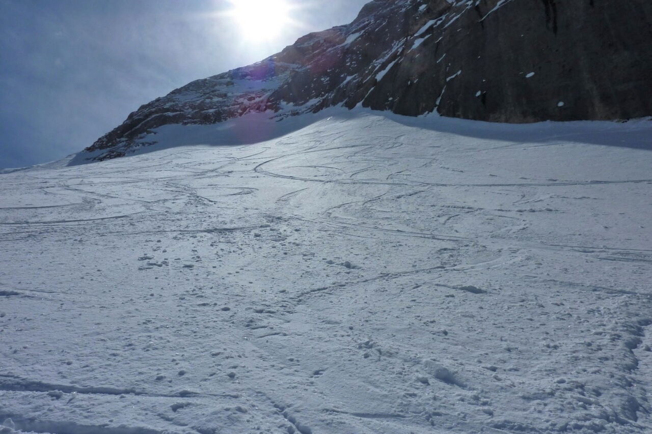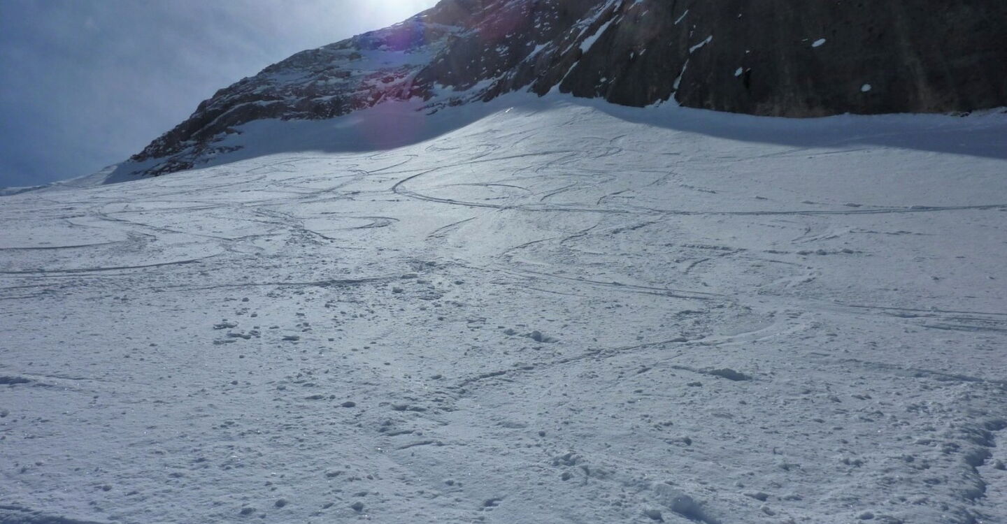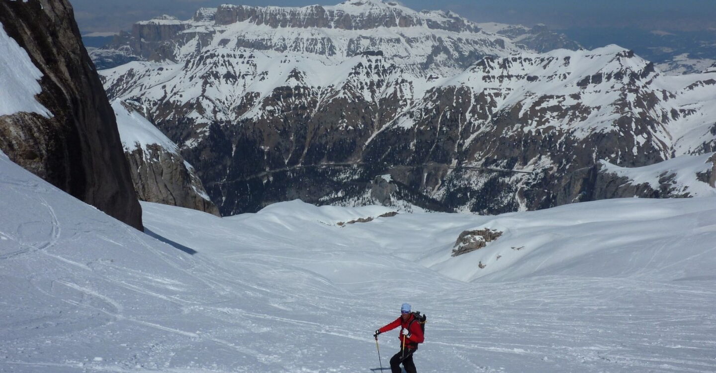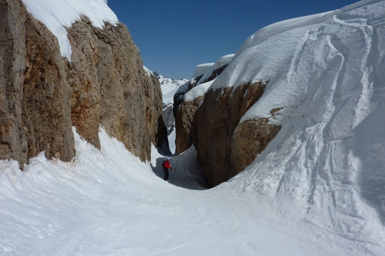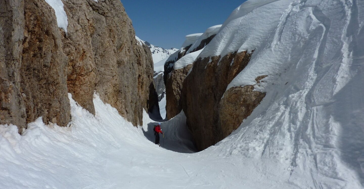 Einfache Abfahrt über den Gletscher. Bitte unbedingt die Absturzwarnung hinter dem Canyon beachten. Die Abfahrt führt über einen Osthang. Folgende Ausrüstung wird empfohlen: Produkte für alpine Sicherheit im Schnee, Freerideski und Skitourenhelm. Es empfiehlt sich die Einkehr in das Rifugio Pian dei Fiacconi auf 2626 m am Ende des Korblifts. Beste Jahreszeit: Januar bis April.