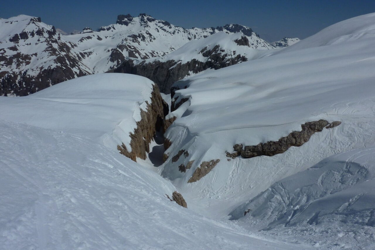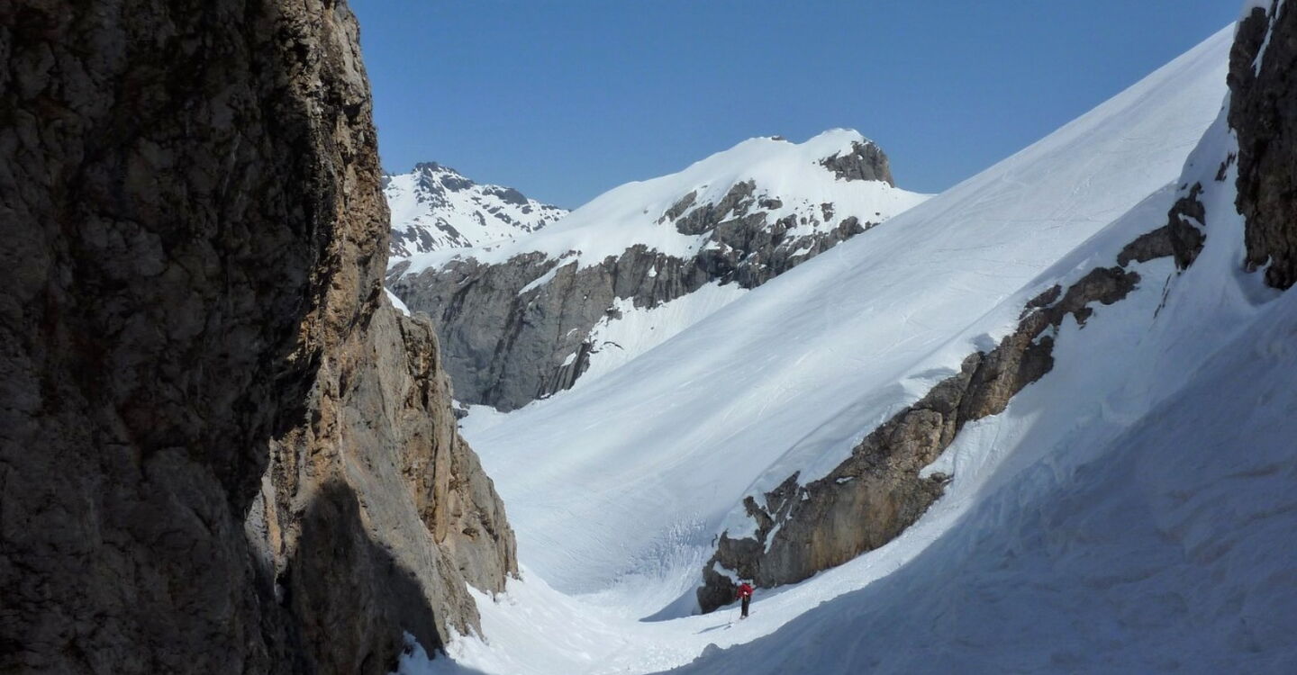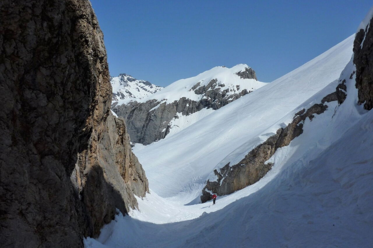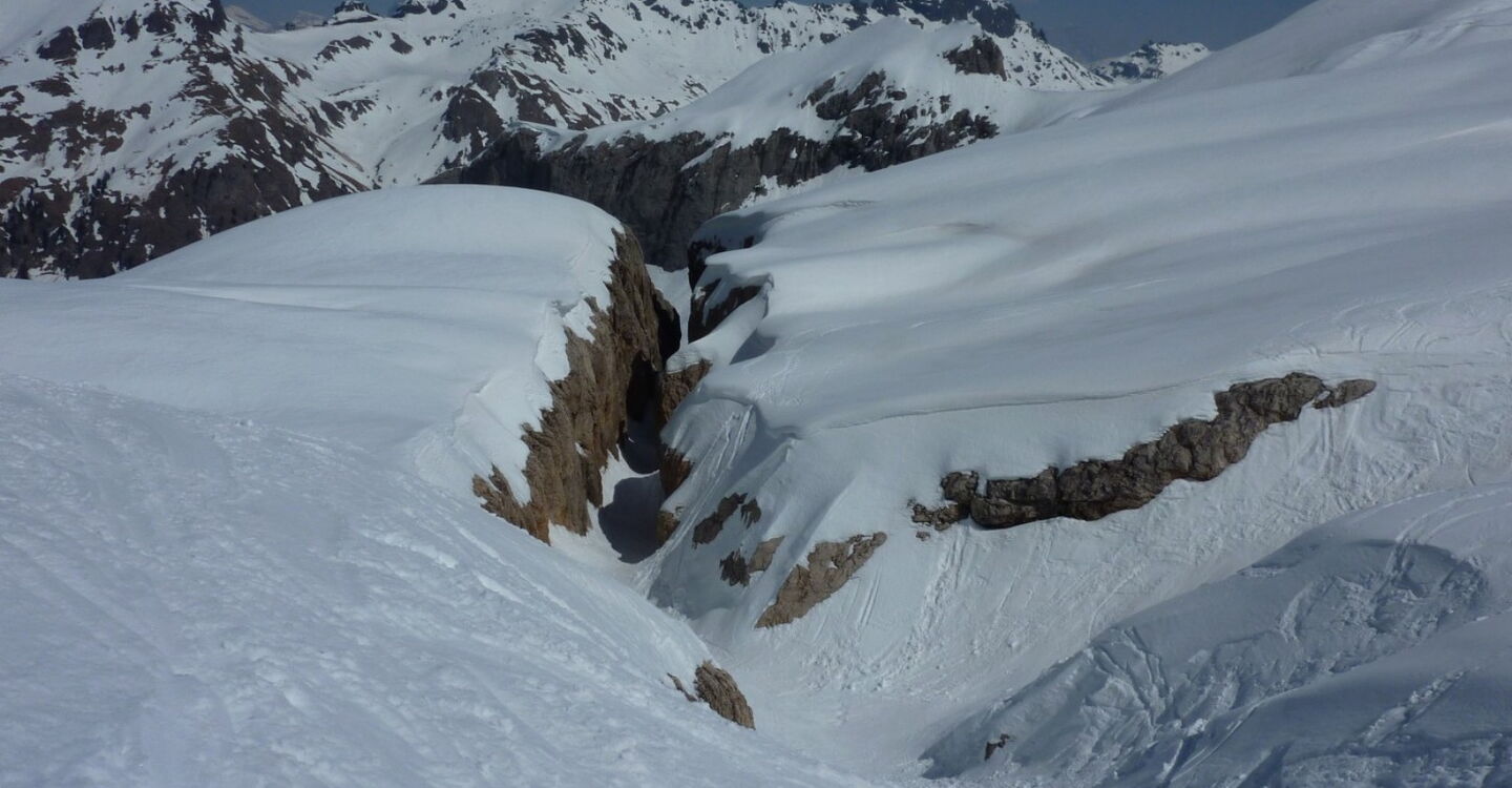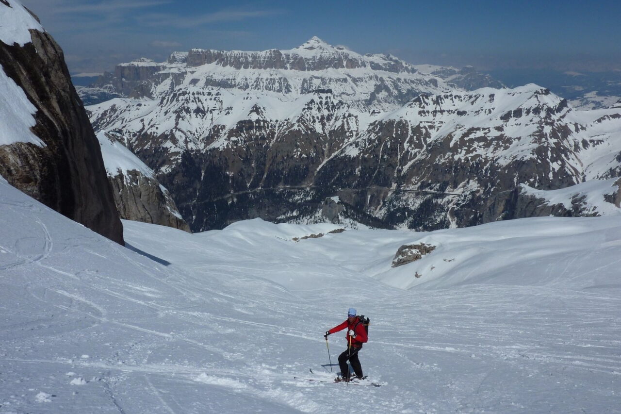 Einfache Abfahrt über den Gletscher. Bitte unbedingt die Absturzwarnung hinter dem Canyon beachten. Die Abfahrt führt über einen Osthang. Folgende Ausrüstung wird empfohlen: Produkte für alpine Sicherheit im Schnee, Freerideski und Skitourenhelm. Es empfiehlt sich die Einkehr in das Rifugio Pian dei Fiacconi auf 2626 m am Ende des Korblifts. Beste Jahreszeit: Januar bis April.