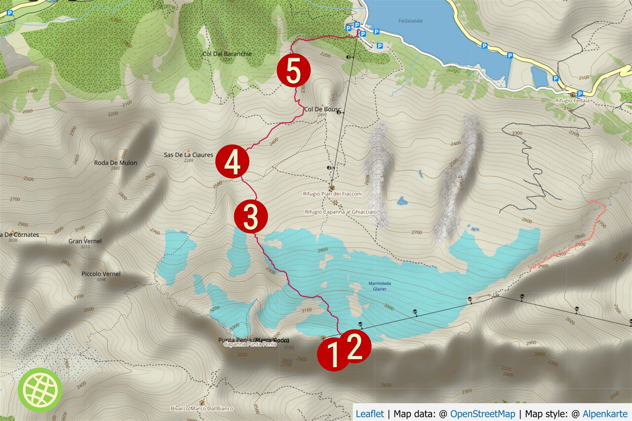 Geokoordinaten zum Start 46.495917 11.8746. Sie führen Dich nach Arabba, wo Du das Auto parkst und mit dem Lift weiterfährst.