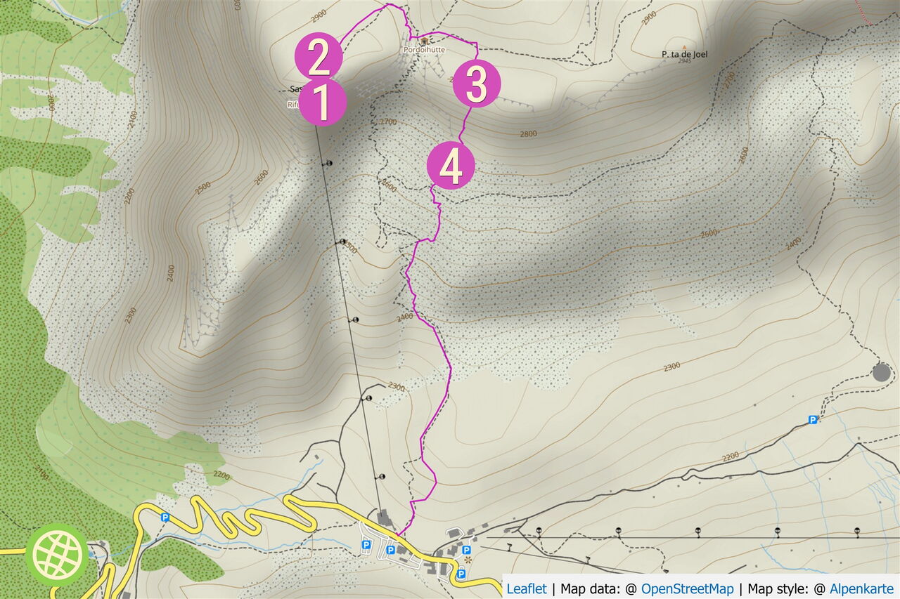 Nach der Pordoi-Seilbahn Nr. 120 fahren wir zum Rifugio Forcella Pordoi ab. Von hier gehen wir noch ca. 250 m geradeaus weiter, bis wir rechts ca. 50 hm zum Einstieg in den Canale Joel aufsteigen.