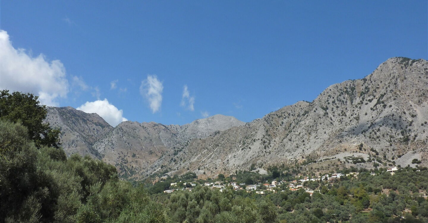 Wir laufen auf einem Wegstück, an dem die Straße eine neue Asphaltdecke bekommen hat, links befindet sich ein graues Gebäude, das wie ein Bunker aussieht, mit einem Oleander und einer Platane. An dieser 02 Schlüsselstelle vor Asi Gonia (267 m) biegen wir links in die asphaltierte Piste ein, die nach einigen Metern schon in eine Schotterpiste übergeht. Wir passieren den Ziegenzaun und gehen parallel zu dem aufgeschütteten Steinwall quer über das Feld, bis wir bei Bäumen ein Trockenbachbett erreichen. Wir gehen rechts im Bachbett, nach einigen Metern gehen wir bei der Bachbettgabelung rechts und im Folgenden 400 m durch das Bachbett. Nach 400 m beginnt rechts auf der Böschung ein Weg, der uns zu einer Brücke führt. Wir queren die Brücke nach links und folgen sofort dem rechten Abzweiger. Auf Wirtschaftswegen geht es bergauf bis zur Asphaltstraße.