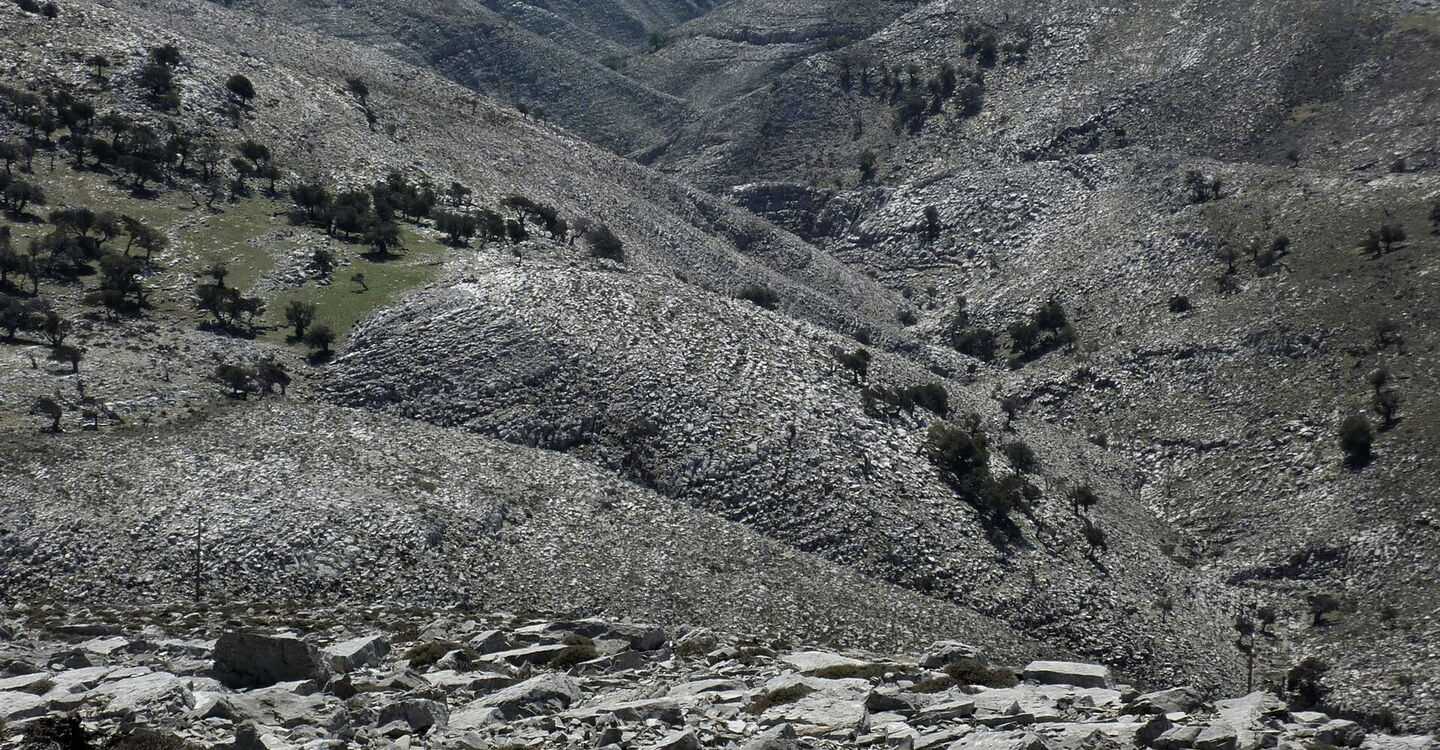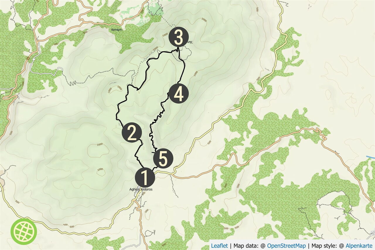 Vom (01) Start und Ziel Agios Isidoros (525 m) gehen wir auf der ortsauswärts führenden Straße Richtung Laerma, bis wir auf eine links bergauf führende Piste treffen, die wir in der ersten Linkskurve nach halb rechts auf einen beginnenden Pfad durch Ziegengatter verlassen. Nach 250 m durch eine Schlucht führt der Weg über einen Bergrücken weiter bergauf.