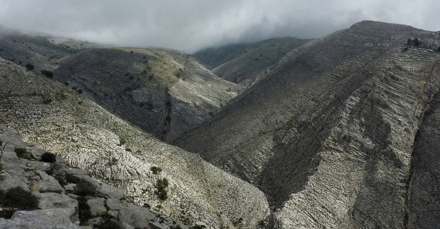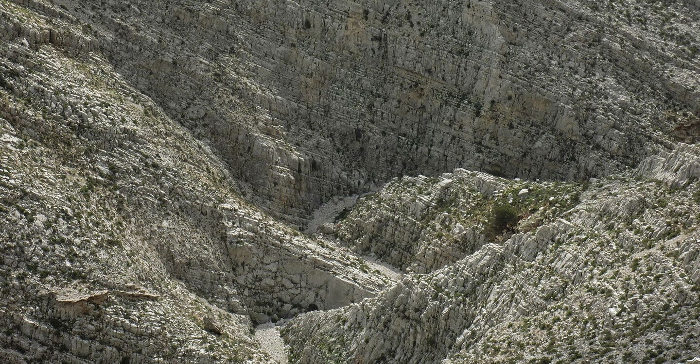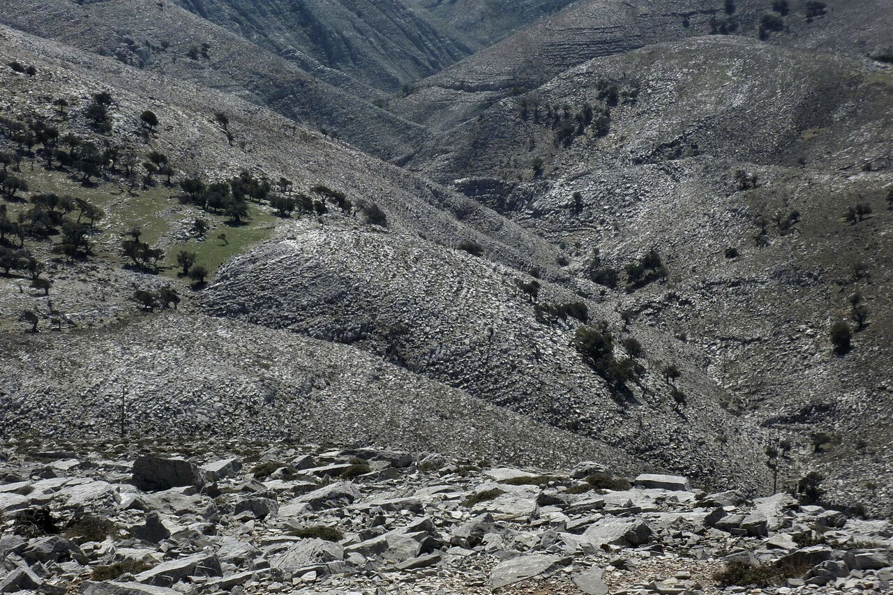 Wir queren zunächst auf einem nahezu ebenen Stück halb rechts den Hang, bis wir dann kontinuierlich an Höhe verlieren. Der Untergrund wird steiniger und wir passieren ein Trockenflussbett. Hier beginnen wir mit unserem direkten Abstieg über (04) Blockgestein (941 m), unter gelegentlicher Zuhilfenahme der Hände. Im Canyon angekommen, liegen 3,8 km Erlebnis vor uns.