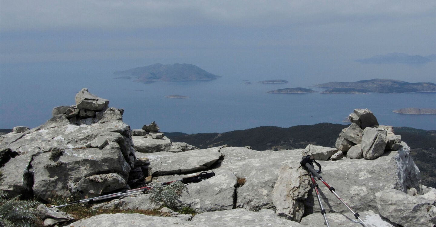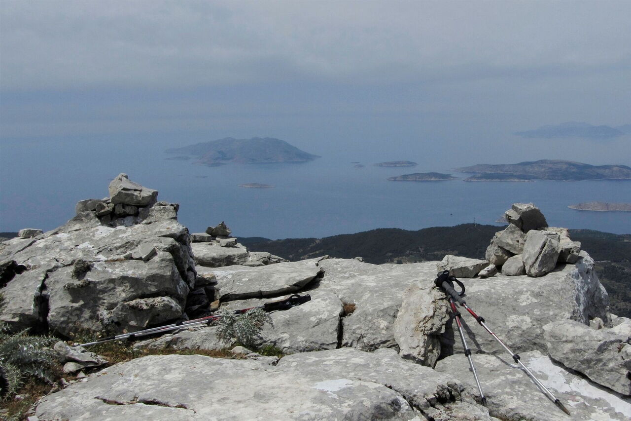 Wir sind nun ein kurzes Stück auf der Piste bergab gegangen und befinden uns jetzt direkt unterhalb des Gipfels. Wir verlassen die Piste nach links, um auf einem Pfad in Serpentinen bis zum Gipfel des (03) Attaviros (1216 m) aufzusteigen. Auf dem Dach von Rhodos haben wir einen atemberaubenden Blick. Von nun an gehen wir weglos am Maschendrahtzaun entlang, lassen die Grundmauern des minoischen Heiligtums von Althaimenes links liegen, überqueren noch die Piste und orientieren uns schließlich halb links in Richtung der Hochebene mit den künstlerisch vom Wind geformten Bäumen.