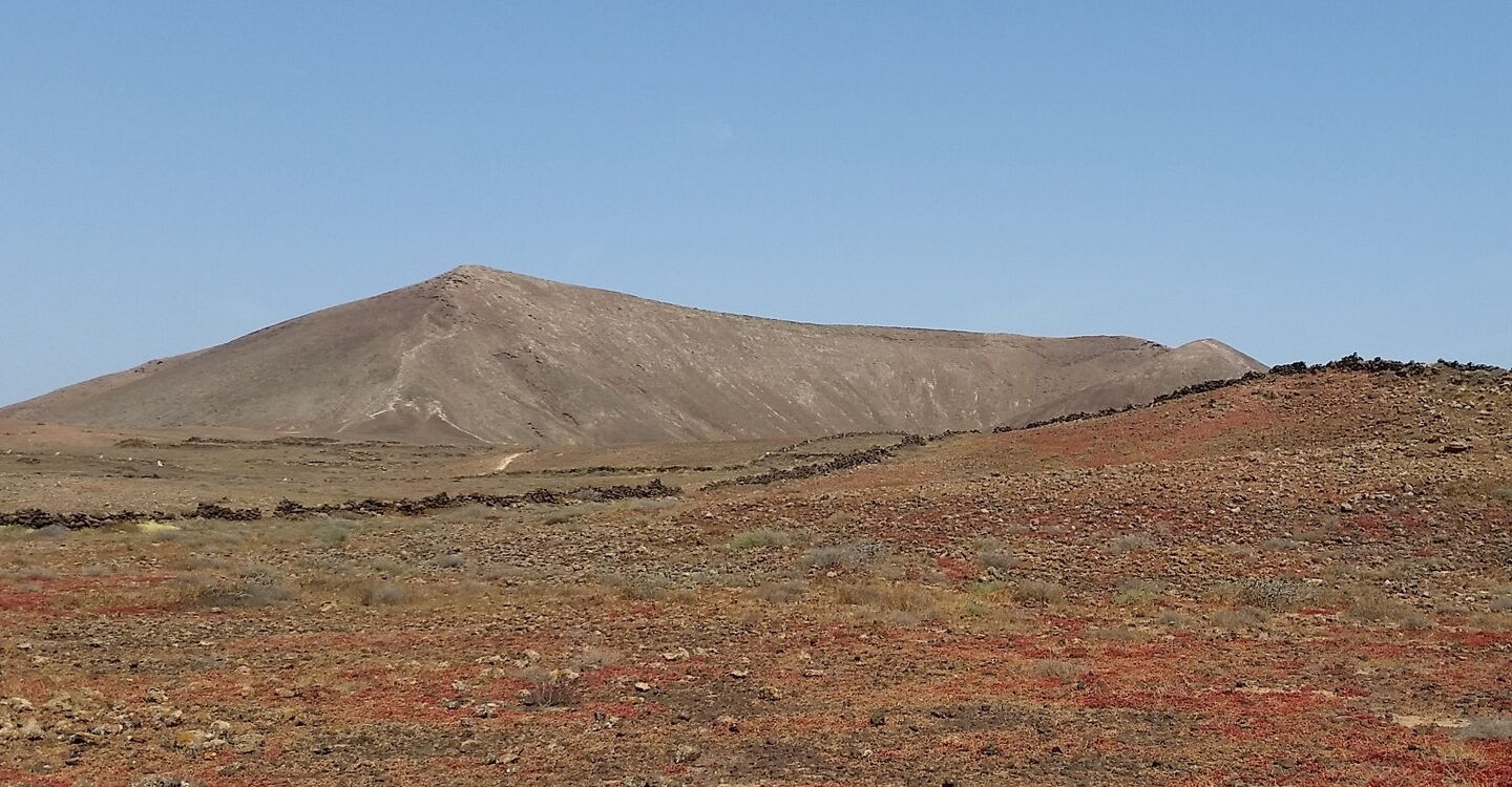 Nach 200 m, bei dem Abzweiger von der Hauptstraße nach rechts, überqueren wir die Straße nach links, passieren die hohe Mauer bei einem Durchlass und beginnen mit dem Aufstieg zum Gipfel der (03) Montaña Corona (225 m). Bei guter Sicht ergeben sich trotz der vergleichsweise geringen Höhe überraschende Fernblicke: So kann man entlang der Ostküste bis nach Arrecife blicken - gut zu erkennen am einzigen Hochhaus der Insel - und bei sehr guter Fernsicht kann man sogar die hell leuchtenden Dünen von Fuerteventura ausmachen. Richtung Norden erstreckt sich das Risco-de-Famara-Gebirgsmassiv (halb rechts), wir sehen die Burganlage von Santa Barbara oberhalb von TEGUISE und weiter links (Richtung Westen) lassen sich die Vulkane Montaña Tamia (550 m) und die Montaña Blanca (595 m) gut ausmachen.