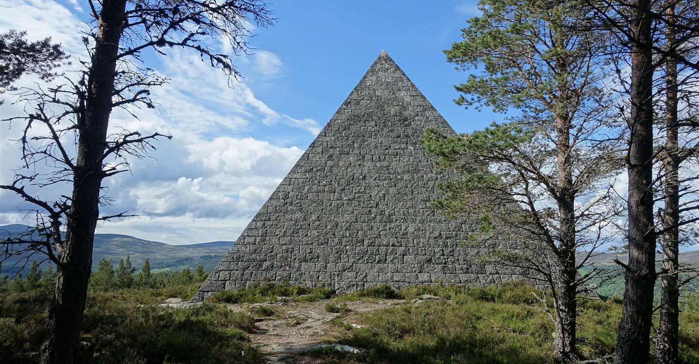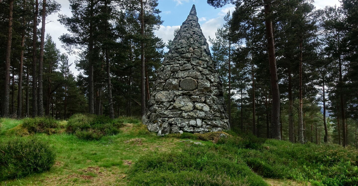 Der weiterführende Pfad endet an einer Forststraße, wir gehen rechts bis zu einer Weggabelung vor. In dieser Senke gehen wir halb links, queren eine Forststraße und gehen geradeaus bergauf durch ein Gatter. Einen rechten Abzweiger, der im weiteren Verlauf über eine kleine Stahlbrücke führt, ignorieren wir, gehen aber nach 20 weiteren Metern steil links. Auf einem unscheinbaren bergauf führenden Pfad erreichen wir den Princess Helena's Cairn (3). Er erinnert an die Heirat zwischen Prinz Friedrich Christian Karl August von Schleswig-Holstein-Sonderburg-Augustenburg und Prinzessin Helena Lenchen – sie war das fünfte Kind der britischen Königin Victoria – am 5. Juli 1866. Wir gehen auf dem Pfad zurück und dann auf dem Hauptweg links weiter und erreichen den links oberhalb liegenden Princess Louise's Cairn (4) – sie war das sechste Kind der britischen Königin Victoria. Der Stein erinnert an ihre Heirat mit John George Edward Henry Douglas Sutherland Campbell, 9. Duke of Argyll oder einfach Marquis of Lorne von 1871. Nach weiteren 200 m befindet sich auf der rechten Seite der 1852 errichtete Steinhaufen Ballochbuie Purchase Cairn (5). Er erinnert an den Kauf des Balmoral Castle und der Ländereien durch Queen Victoria und Prince Albert am 15. Mai 1878. Seitdem gehört das Schloss zum Privatvermögen der königlichen Familie. Bei einer Weggabelung gehen wir halb rechts und erreichen den 03 Prince Leopold's Cairn (374 m) (6) – er war das achte Kind. Der Cairn erinnert an die Heirat von Leopold mit der deutschen Prinzessin Helene zu Waldeck und Pyrmont am 27. April 1882. Durch diese Heirat wurde sie ein Mitglied der britischen Königsfamilie. Von hier hat man einen gigantischen Blick auf das Balmoral Castle – ein sehr selten gesehenes Fotomotiv.