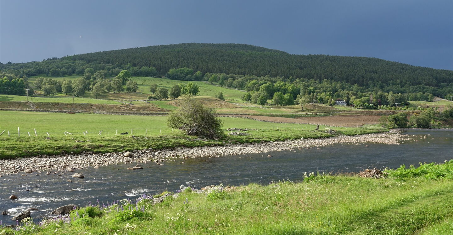 Wir gehen über den kostenpflichtigen Parkplatz in der kleinen Ortschaft Crathie Richtung Ballater. Auf Höhe des Souvenirladens befindet sich links oberhalb die 01 Crathie Kirk (274 m), wir gehen dort rechts auf der Asphaltstraße herunter. Im weiteren Verlauf ignorieren wir den rechten Abzweiger zum Friedhof und gehen bis zum Ende der Straße. Dort gehen wir dann rechts, halten uns hinter der Suspension Bridge über den Fluss Dee rechts, biegen nach weiteren 80 m links ab und nehmen dann die zweite Straße links – die erste führt zur Royal Lochnagar Distillery. Unser Weg führt an malerisch gelegenen Cottages vorbei.