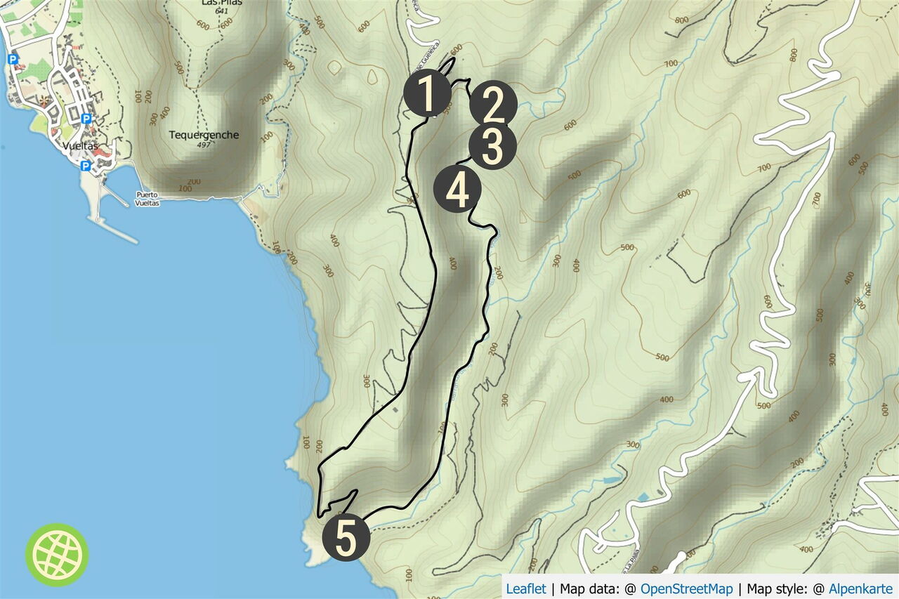 Am (01) Start und Ziel (612 m) übersteigen wir die Metallkette und gehen bergab - vorbei an einigen Häusern -, bis wir nach einer langen Kehre das letzte Haus vor dem Barranco erreichen. Noch vor dem Haus (etwa 20 m) führt rechts ein Pfad auf die Terrassenfelder am Barranco herunter. Wir gehen an dem rechts von uns liegenden Zaun entlang, bis wir in das Barranco einsteigen. Durch dieses gehen wir rechts weiter, bis der Zaun endet und wir oberhalb eines Wasserfalls stehen. Hier beginnt links bergauf ein selten begangener Pfad. Im weiteren Verlauf passieren wir eine rechts von uns stehende Palme und sehen eine Ruine, die sich 60 m oberhalb des Weges befindet. Kurzfristig ist der Pfad schwer auszumachen, bis wir auf einen gut zu erkennenden Pfad stoßen, welcher nun halb links - in östliche Richtung - bergab führt.