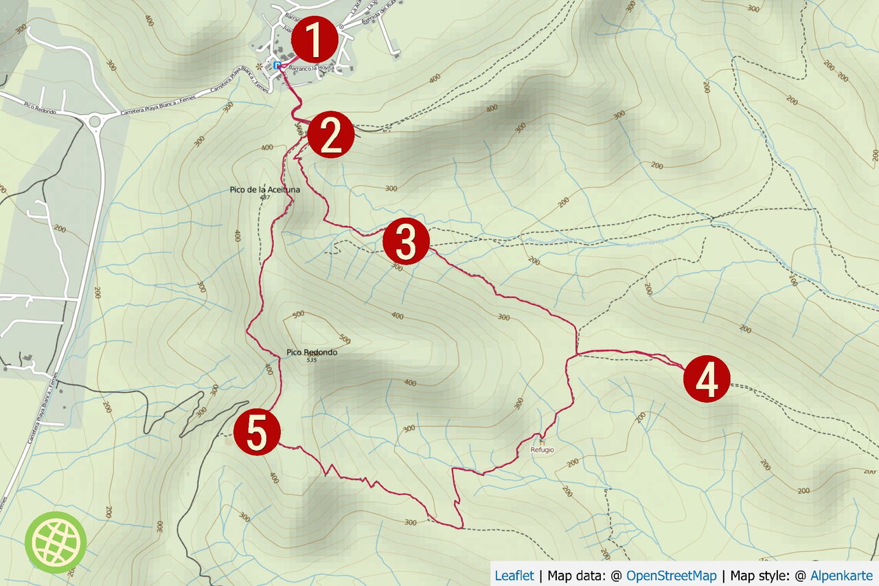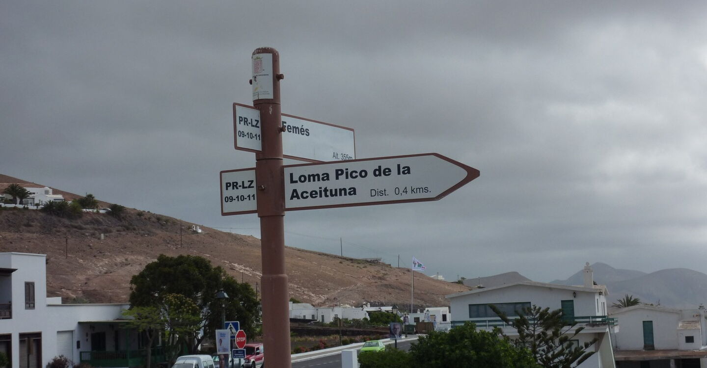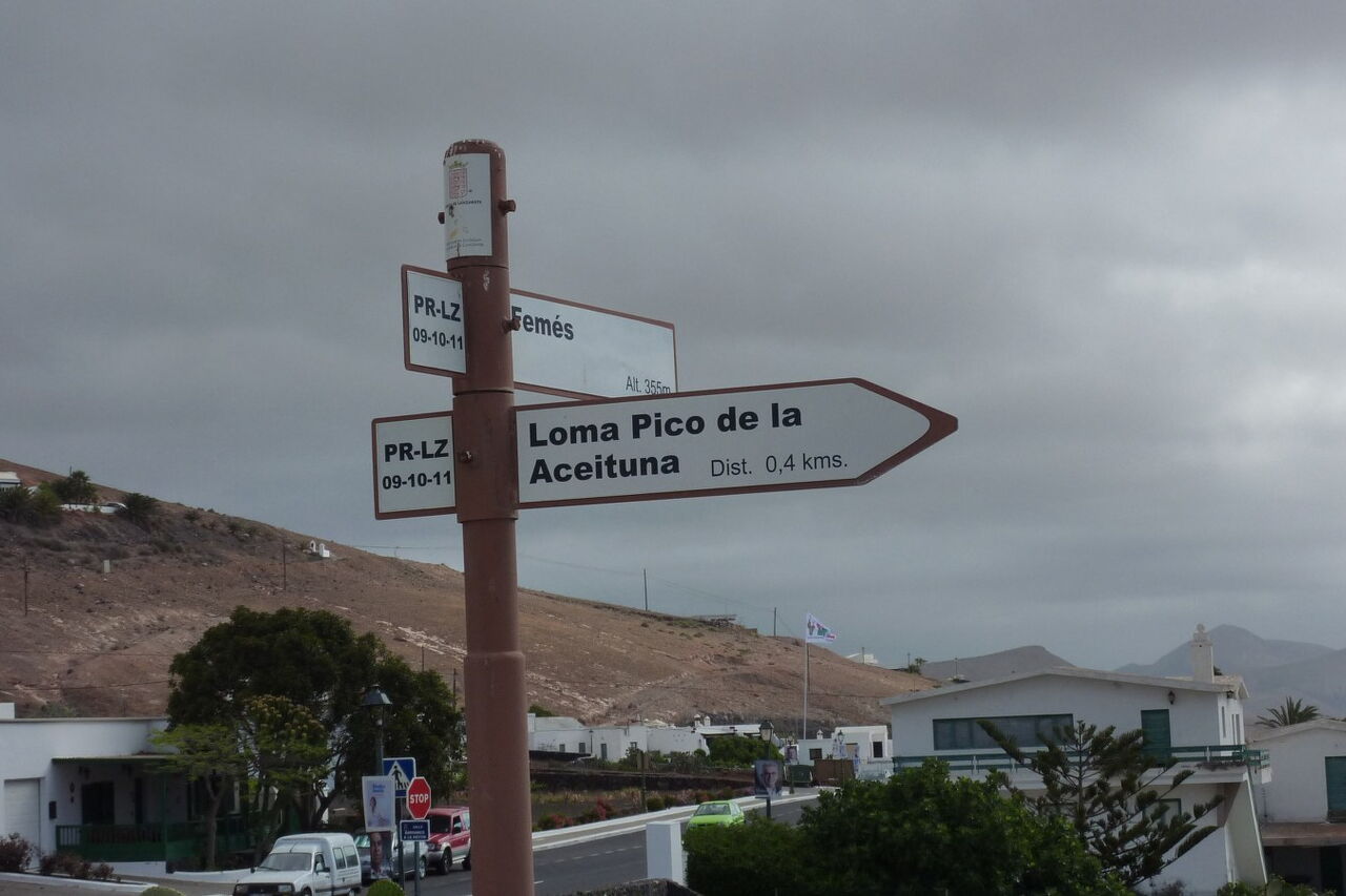 Von der Bushaltestelle (01) in Fémes (355 m) gehen wir Richtung Playa Blanca, also bis zum Kreisverkehr, vor. Rechts von uns befinden sich ein Parkplatz und die Kirche. An der nun gegenüberliegenden Ausfahrt im Kreisverkehr, bei dem Wegweiser Richtung Loma Pico de la Aceituna, führt eine Schotterstraße in kleinen Kehren zu dem braun-gelben Gebäude einer Ziegenhaltung hinauf.