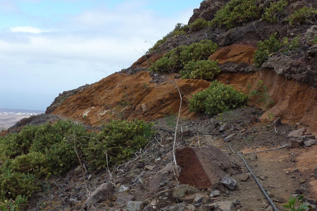 Danach geht es in Kehren 2 km und 200 Höhenmeter bergauf bis zur Einsattelung (05) Degollada de Portugués (431 m). Links, etwas unterhalb unseres Standorts, liegt eine weitere Ziegenhaltung. Von dort führt eine Schotterstraße zur LZ-702, in die El-Ruicón-Ebene. Rechts von uns befindet sich ein Abzweiger auf den Pico Redondo. Wir gehen aber auf dem eingeschlagenen Weg weiter - dabei macht der Weg eine leichte Rechtskurve um eine Kuppe herum -, bis wir nach 100 m auf einen Pfad treffen. An dieser Stelle wandern wir weiter rechts und gehen nun Richtung Norden durch die Westflanke des Pico Redondo. An den Stellen, wo der Weg angelegt wurde, schimmert hellbraunes Gestein hindurch. Als Orientierungshilfe können wir eine Wasserleitung nutzen, die auf dem ersten Teilstück parallel zum Weg verläuft. Im Verlauf gehen wir unter zwei Strommasten hindurch und erreichen bald die Ziegenhaltung, die wir bereits vom Hinweg kennen. Von hier aus gehen wir das letzte Teilstück bis nach Femès herunter.
