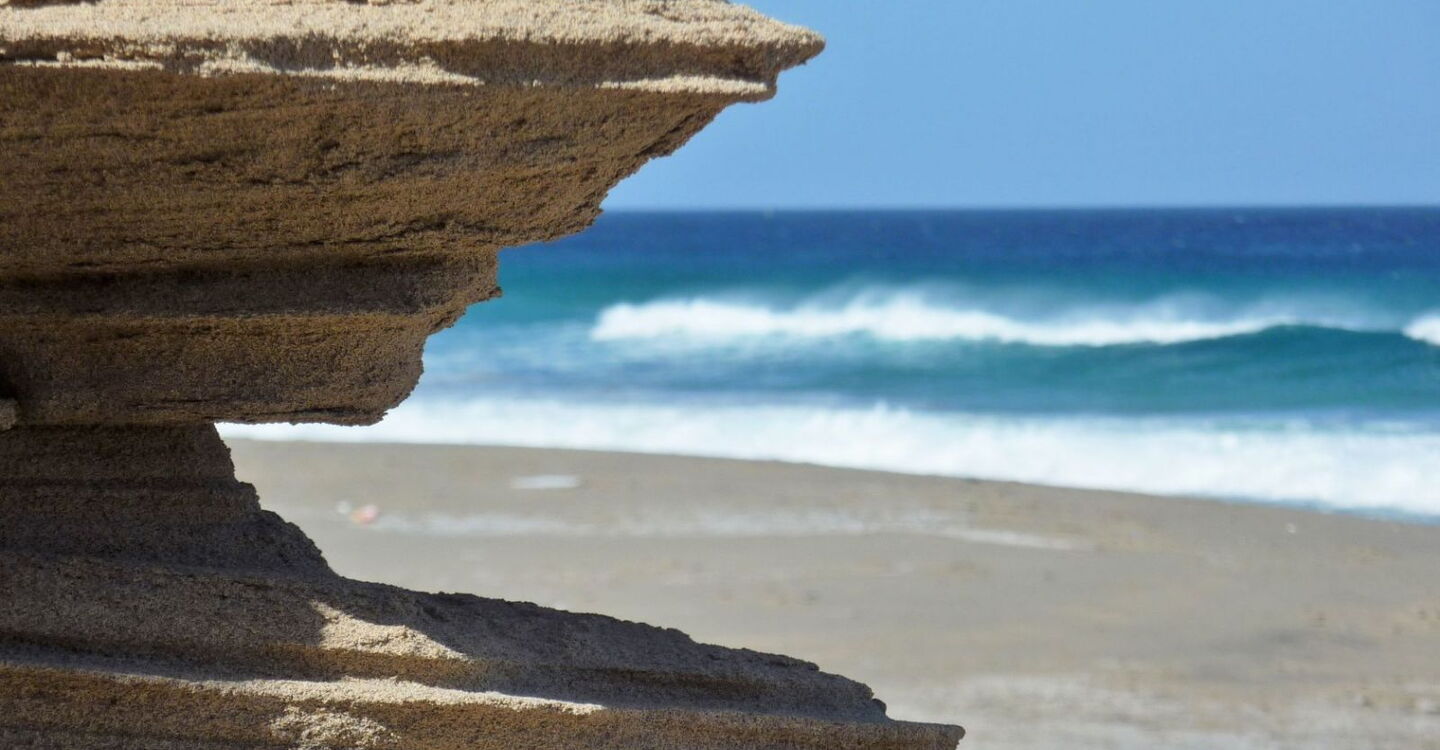 Ohne Frage, die Anfahrt mit dem Pkw hat es in sich. Aber die Belohnung folgt zugleich, ein Strandtag in der absoluten Einsamkeit der Westküste der Jandia-Halbinsel. Über 1,5 km Länge erstreckt sich der feine, hellbraune Sandstrand unterhalb der imposanten, bis zu 800 m hoch aufragenden Felsformationen – den höchsten Erhebungen der Insel. An 80 % aller Tage bläst der Passatwind und befördert die milde Seeluft in die Atemwege. Ein weiteres besonderes Naturschauspiel sind die 36 m hohe, erstarrte Felssäule des Roque de Moro, die vielen Sandsteinobjekte und die Intarsien auf den Felsen. Eine Entdeckungsreise für die ganze Familie.