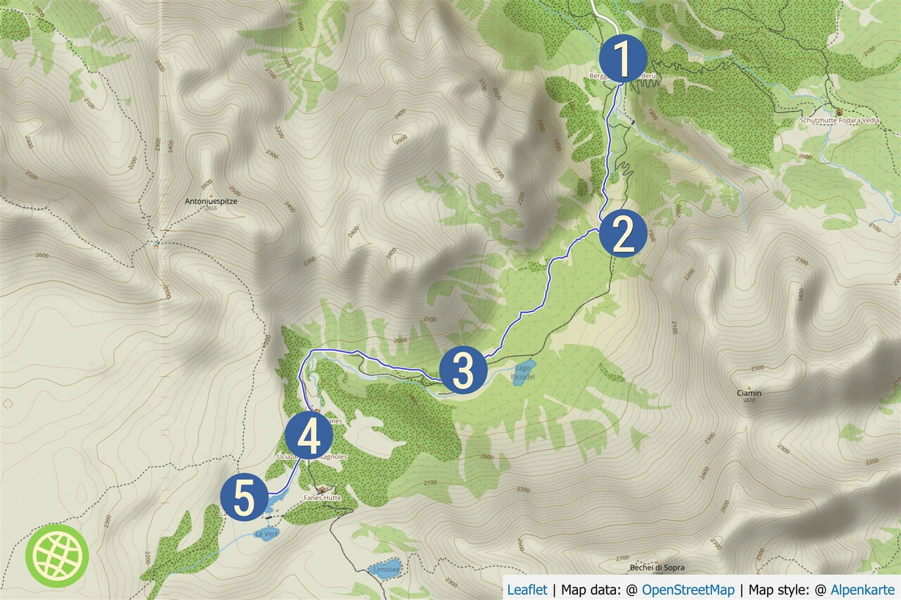Startpunkt/Einstieg/Abbruch: Das Berggasthaus Pederü ist zu Fuß, mit dem Pkw und mit dem Bus erreichbar und befindet sich am Ende der Tour 4. Endpunkt: Die Lavarella-Berghütte ist nur zu Fuß erreichbar und befindet sich am Anfang der Tour 6.