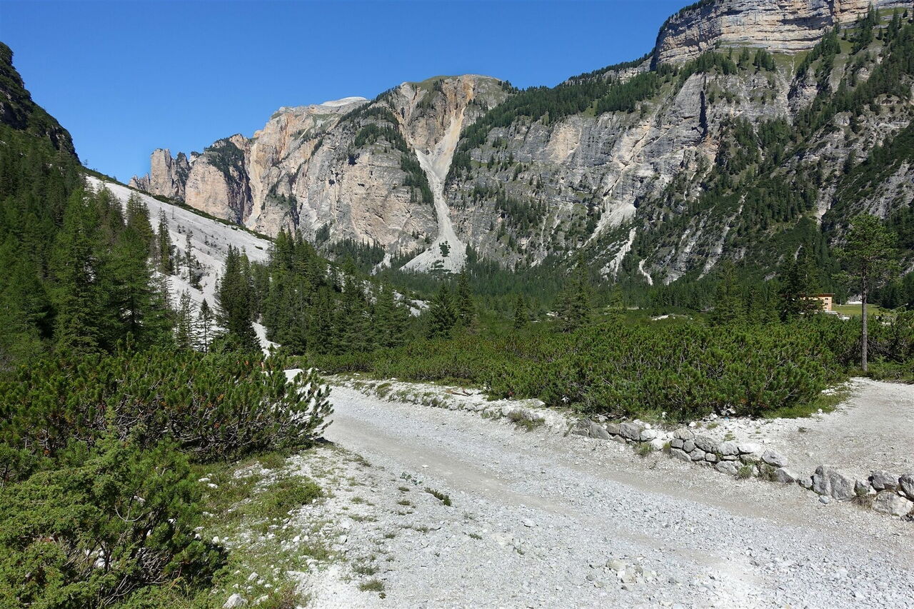 Vom 01 Berggasthaus Pederü (1.545 m) gehen wir ca. 100 m auf dem Kieselsteinweg (Wanderweg 7) in südliche Richtung, bevor wir den Bachlauf über eine Brücke queren. Dahinter gehen wir links und marschieren durch Latschenkiefern bergauf, weiterhin auf einem Kieselsteinweg. Zwischenzeitlich überqueren wir eine Schotterpiste, die bis in das Hochtal des Fanes-Sennes-Prags-Naturparks führt. Alternativ kann man auch auf der Schotterpiste bergauf gehen, die nachfolgende Beschreibung gilt für den kürzeren und schöneren Wanderweg. Der nachfolgende Pfad ist mit Holzpfosten befestigt, da der komplette Hang abgerutscht war.