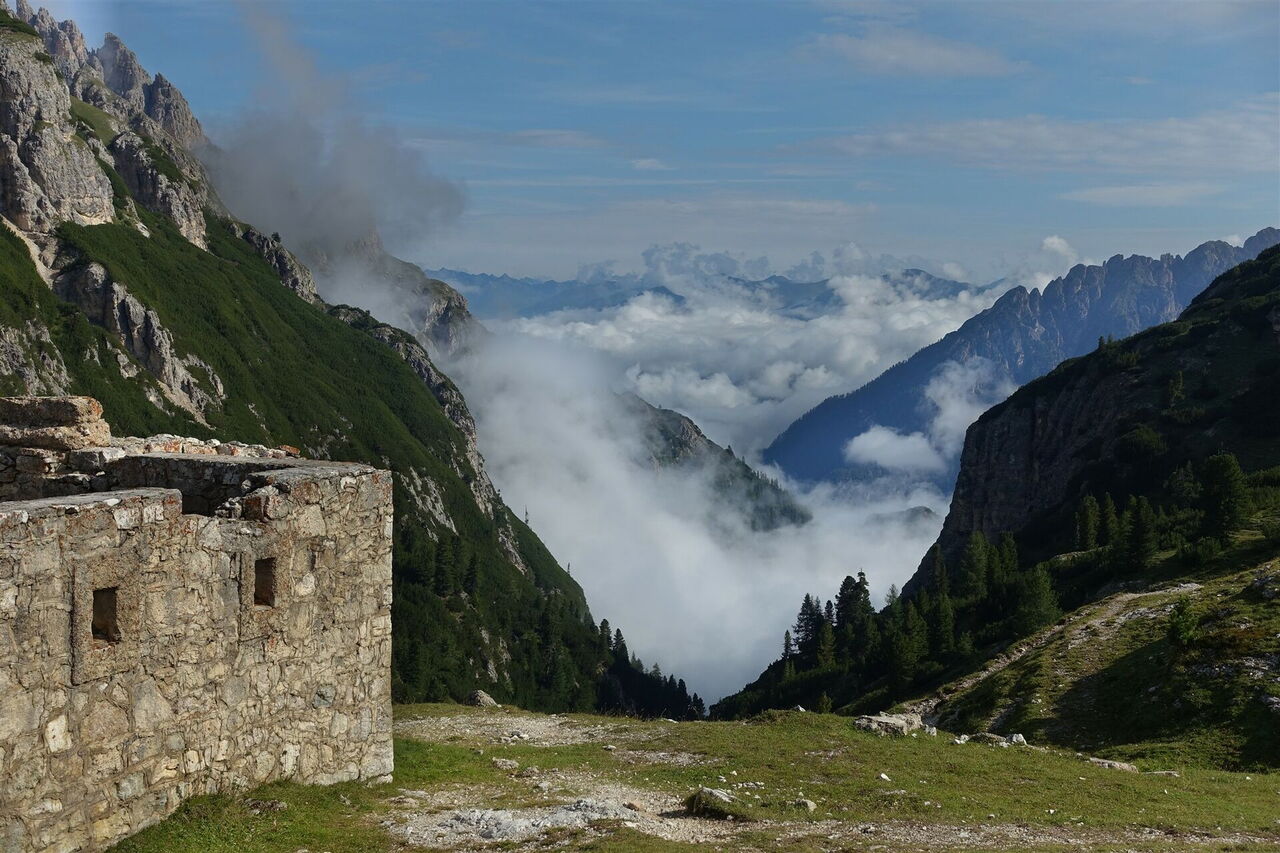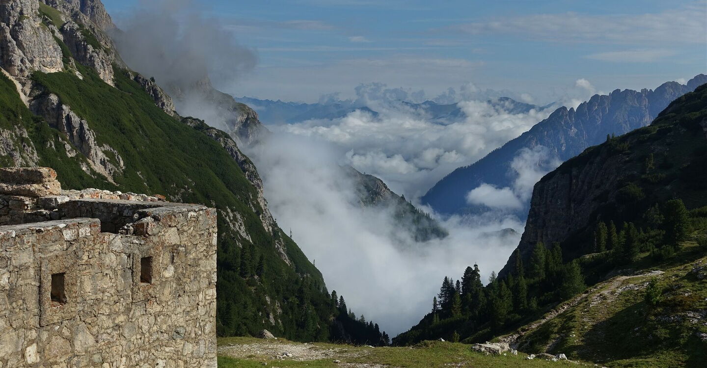 Nach langem Abstieg erreichen wir das Höhlensteintal und gehen zunächst am Bachlauf entlang. An der Hauptstraße gehen wir links über die Brücke, dann hinter der Brücke rechts und schließlich am Parkplatz vorbei bis zum 03 Drei-Zinnen-Blick (1.391 m). Wir folgen dem Wanderweg 6 Richtung Osten, auch ausgeschildert zum Monte Piano. Nach ca. 250 m gehen wir an der Weggabelung halb rechts und überqueren nach einem längeren Stück eine Brücke. An der sofort darauffolgenden Gabelung gehen wir halb links auf dem bergan führenden Pfad. Nach sehr steilem Aufstieg, teilweise durch Metallketten versichert, erreichen wir einen Soldatenfriedhof, der auf einem schmalen Bergrücken liegt.