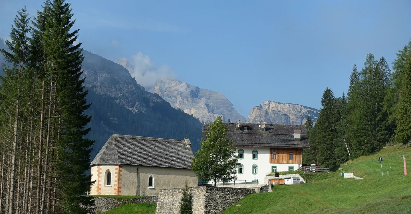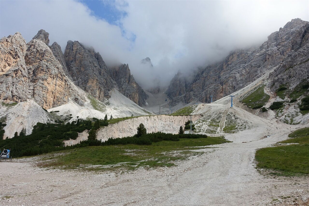 Einen linken Abzweiger zum Via Ferrata Dibona und den darauffolgenden rechts abzweigenden Forstweg über die Brücke ignorieren wir. In einem wunderschön gelegenen Hochtal unterhalb der Gipfelwelt der mächtigen Spitzen der Cristallogruppe marschieren wir an einer Ruine und einem Heiligenschrein vorbei. Wir ignorieren weitere abzweigende Pfade, queren ein Bachbett und unterqueren den Skilift Padeon. Auf einem Fahrweg geht es links neben der Skipiste bergauf, dann queren wir die Skipiste nach halb rechts und kommen an einem künstlich angelegten See vorbei. Wir ignorieren abzweigende Pfade und gehen bis zum Passo Son Forca. Von dort kann man direkt mit dem Abstieg beginnen. Ein lohnenswerter Abstecher ist das oberhalb liegende 03 Rifugio Son Forca (2.235 m). Auf dem Weg dorthin blickt man direkt auf die faszinierende Cristallo-Scharte, gelegen zwischen dem Piz Popena und dem Monte Cristallo.