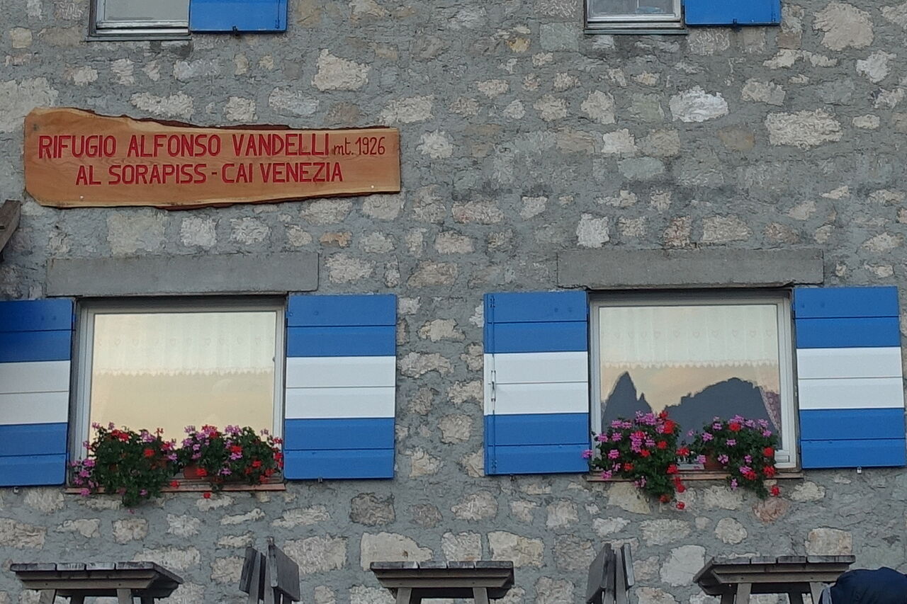 Zunächst führt der Wanderweg gemächlich durch den Wald, aber hinter einem Wasserfall steigt der Pfad an. Bei der darauffolgenden Weggabelung gehen wir halb rechts, auch ausgeschildert Richtung Rifugio Vandelli. Anschließend geht es über Metalltreppen und einen schmalen, mit Stahlseilen gesicherten Pfad, für den Trittsicherheit und Schwindelfreiheit ein Muss sind. Der Wanderweg gabelt sich abermals, links führt der Wanderweg 243 zum 05 Rifugio Vandelli (1.928 m), rechts führt der Wanderweg 215 zum Lago del Sorapiss.