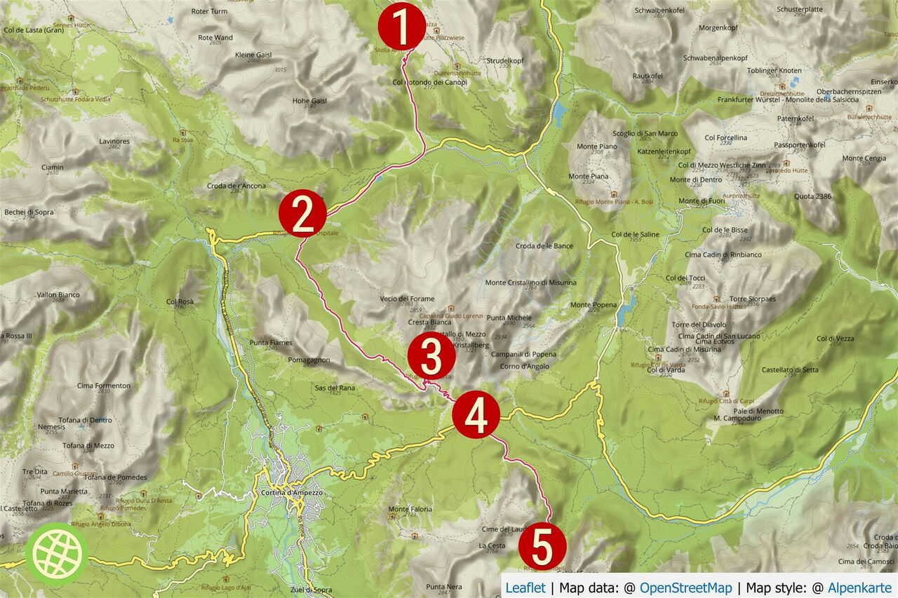 Die Touren 59 und 60 ergeben addiert eine Wanderzeit von 10 Stunden und 30 Minuten, 29,6 km Länge, 2.100 m Anstieg und 2.100 m Abstieg. Entscheidet man sich für die Variante 71, so verkürzt sich die Wanderung um: 2 Stunden und 15 Minuten, einen Wandertag, 4,6 km, 1.020 Höhenmeter im Anstieg und 1.000 Höhenmeter im Abstieg. Die Variante 71 führt in einem großen Halbrund um die wunderschöne Cristallogruppe mit den bekannten Größen Cima di Mezzo, Monte Cristallo (3.221 m) und Piz Popena. Aufgrund ihrer Länge ist die Strecke körperlich anstrengend! Außerdem ist zu beachten, dass man am darauffolgenden Tag die Tour 61 vor sich hat, die schwerste Etappe des Dolomitenhöhenweges Nr. 3.