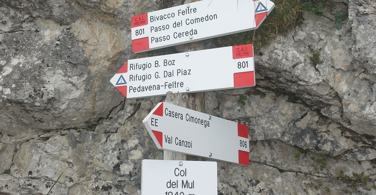 Am 02 Col de Mul (1.840 m) ignorieren wir den linken Abzweiger in Richtung der Casera Cimonega und gehen geradeaus weiter. Wir marschieren ein langes Wegstück durch Latschenkiefern. Auf dem darauffolgenden abzweigenden Pfad ignorieren wir den Weg 806 Richtung Val Canzoi.