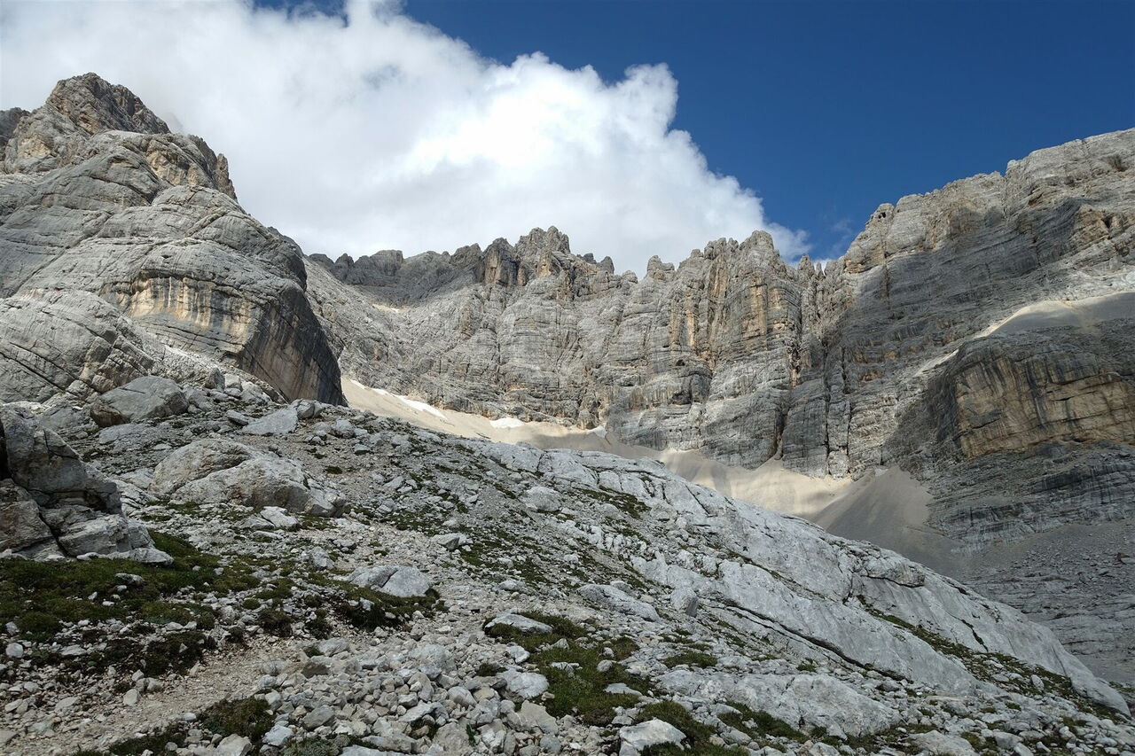 Vom 01 Bivacco Slataper (2.600 m) folgen wir dem bergab führenden Wanderweg 246. Er führt ein kurzes Stück in östlicher Richtung in das riesige Kar zwischen dem 3.002 m hohen Monte della Caccia Grande und dem 3.005 m hohen Punte Tre Sorelle.