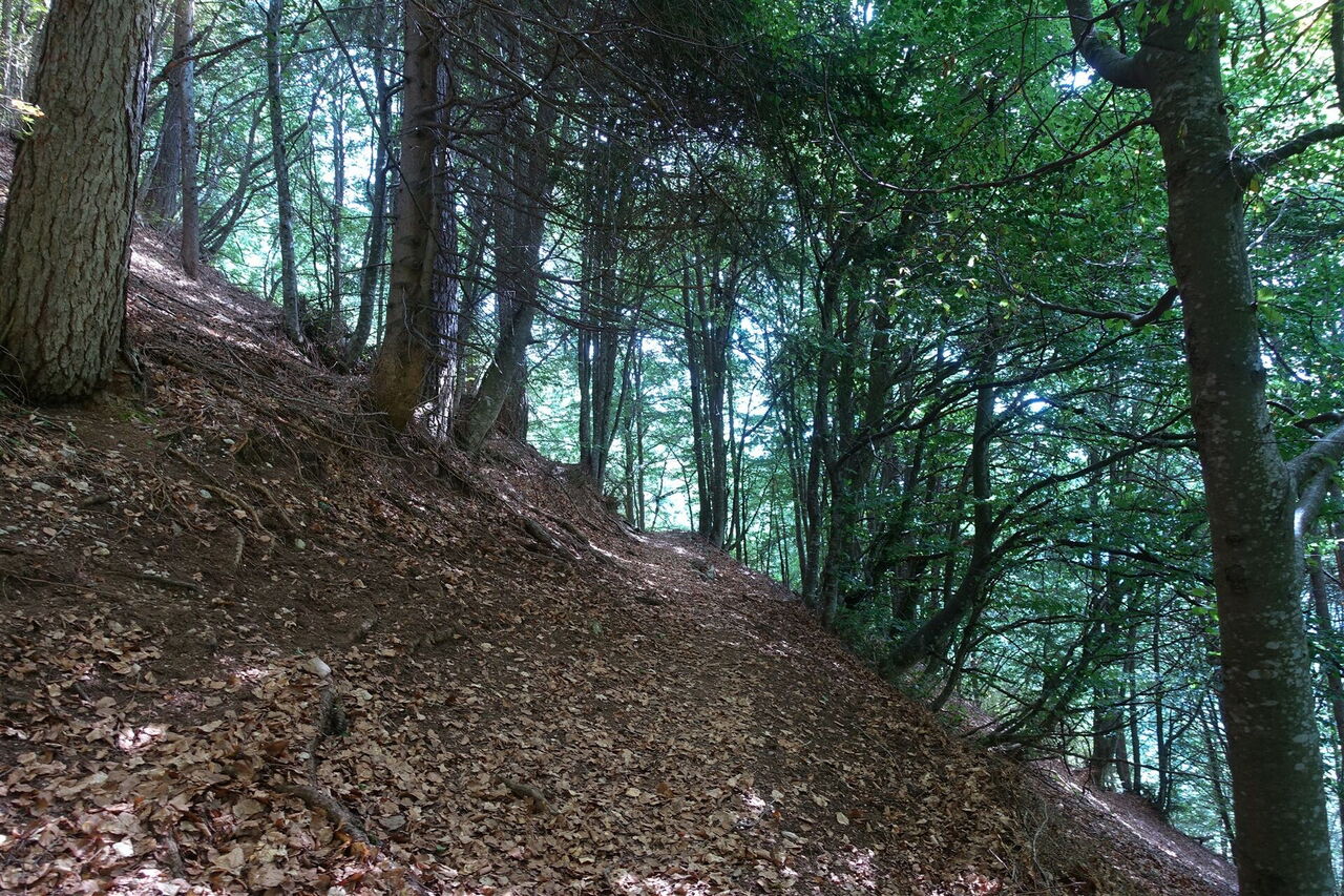 Nachdem wir die steilen und grasbewachsenen Berghänge hinter uns gelassen haben, gelangen wir in den 03 Bosco (Wald) (1.417 m). Im Wechsel zwischen grasbewachsenen Lichtungen und weiteren Waldstücken gehen wir nun kontinuierlich bergab, bis wir dann an einem Kreuz, einer Bank und einem Heiligenschrein vorbeikommen. Ca. 30 m hinter dem Heiligenschrein gehen wir rechts weiter, nun auf einem mit Steinen gesäumten Pfad – weiterhin der Wanderweg 482.
