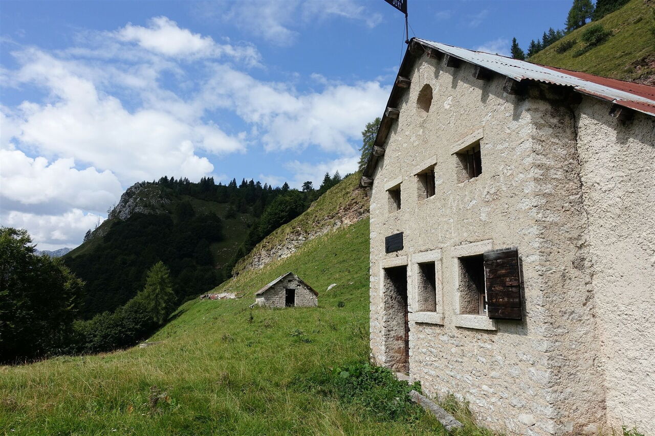 Vom 01 Bivacco Tovanella (1.688 m) folgen wir dem schlecht zu erkennenden weiterführenden Pfad. Es gibt zwar keine entsprechenden Hinweise, aber es handelt sich um den Wanderweg 482, auf dem man nur wenige rote Markierungen findet. Wir steigen nicht nach rechts in das Tal ab, sondern gehen leicht ansteigend in südwestliche Richtung, um unterhalb von Felsen auf einem nun gut zu erkennenden Pfad durch einen lichten Wald aufzusteigen.