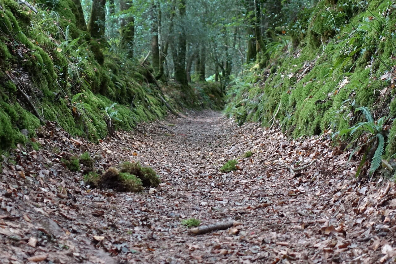 Es folgt ein wunderschöner Hohlweg. Der weitere Verlauf: Wir passieren ein Viehgatter, der Pfad mündet in einen breiteren Weg, auf dem wir weitergehen, wir laufen durch eine Linkskurve und über einen kleinen Bachlauf und an einer Lichtung halten wir uns links. Durch eine Buchenallee gehen wir nun direkt auf die 1550 erbaute 05 Chapelle de Trémalo (62 m) zu. Wir setzen unseren Weg auf der nach Osten weiterführenden Straße fort, um dann bei dem Sackgassenschild und einem auffallenden roten Wasserhydranten rechts abzubiegen. In der darauffolgenden Rechtskurve der Straße – hier befindet sich auch ein Holzgatter – gehen wir links und dann gleich vor der Lichtung rechts, um den nachfolgenden Pfad zu erreichen. Dieser mündet in eine Straße und die Brücke, unter der wir unser Auto geparkt haben.