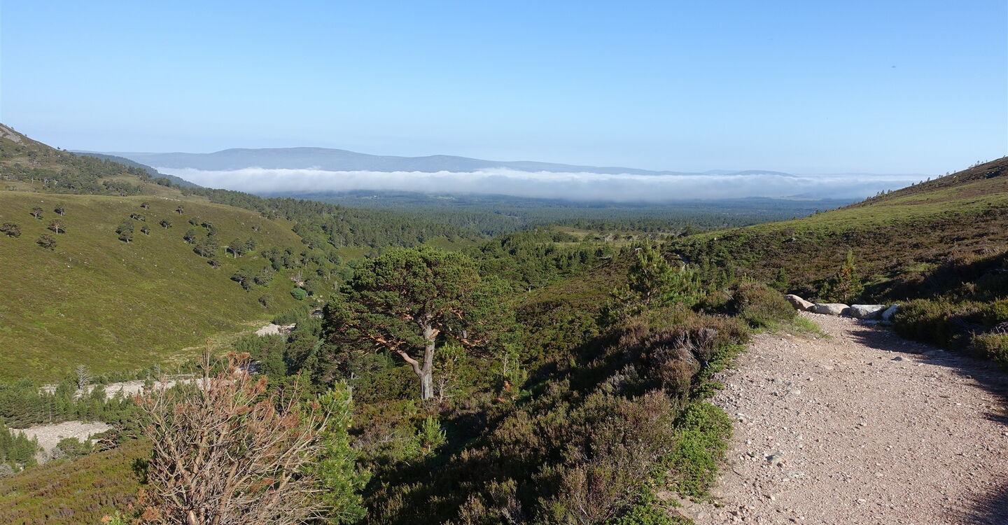 Direkt vor dem 01 Parkplatz in Whitewell (304 m) biegen wir links auf den gekennzeichneten Wanderweg Rothiemurchus ab, der bereits nach 230 m endet. Wir gehen dann rechts auf der Piste weiter. Bei der nachfolgenden Wegekreuzung halten wir uns links Richtung Loch Morlich, gerade über die Wegekreuzung befindet sich unser Rückweg. Unser Weg führt vorbei an dem schönen und idyllisch im Wald liegenden Loch Deo und mündet nach insgesamt 2 km in eine weitere Piste – der Pfad von Coylumbridge. Wir queren die eiserne Brücke über den Fluss und wandern durch den einmaligen Kiefernwald. Nach 3,7 km folgen wir dem rechten Abzweiger in das Tal Lairig Ghru. Allmählich lassen wir den Kiefernwald hinter uns, zunächst stehen noch verstreut ein paar Exemplare, bis wir dann durch baumloses Gelände wandern.
