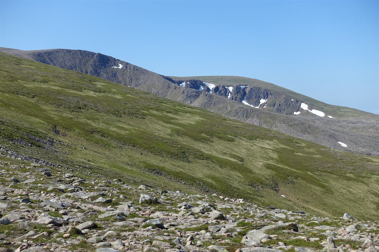 Nach 8,5 km allmählicher Annäherung beginnt nun endlich der richtige Aufstieg, der zunächst recht steil ist. Dabei ergeben sich wunderschöne Fernblicke in die Bergwelt der Cairngorms. Ein Pfad ist immer gut auszumachen und nach einem kurzen Abstieg erreicht man das flache Gipfelplateau des 03 Sron Na Lairige (1184 m). Es folgt ein kurzer Abstieg zu einer Einsattelung, um dann auf dem zunächst breiten Grat des Braeriach aufzusteigen.