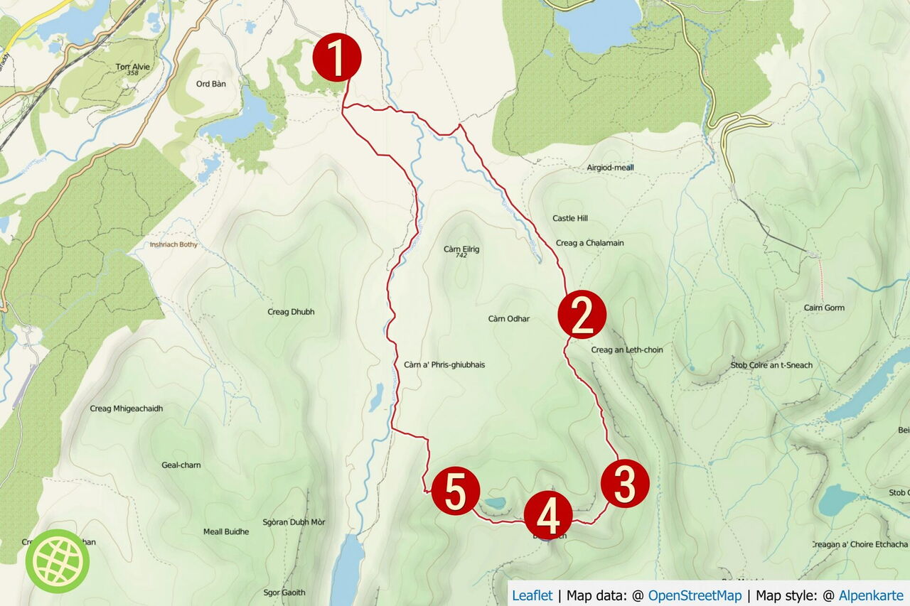 Sobald wir freien Blick ins Tal haben, gehen wir halb links auf dem Bergrücken weiter, dabei orientieren wir uns in Richtung des Nachbargipfels Sgoran Dubh Mor auf der anderen Talseite und suchen nach einem Pfad, der durch ein Steinmännchen gekennzeichnet ist. Nachdem wir einen Pfad gequert haben, geht es zunächst in engen Kehren in Richtung des Tals 05 Gleann Eanaich (954 m). An einer freigespülten und steinigen Fläche gehen wir geradeaus weiter, um danach wieder auf den Pfad durch die Heidewiesen zu gelangen. Wir queren zweimal einen Bachlauf, bis der nun wieder schwer auszumachende Pfad entlang weniger Steinmännchen den Hang quert – dadurch umläuft man sehr sumpfiges Gelände. Der Pfad führt bis zu einem weiteren, größeren Bachlauf. Zu diesem parallel steigen wir links, weiterhin weglos, zu der unterhalb liegenden Piste ab. Nach Kilometer 19 ist die Bergtour eigentlich schon beendet, es folgt noch gemütliches Auslaufen talauswärts. Im weiteren Verlauf wird der Flusslauf gequert. Bei den ersten Kiefern verlassen wir die Piste nach halb rechts und wechseln auf den Pfad entlang des Flusslaufes, den wir begehen, bis wir schlussendlich auf die bekannte Wegekreuzung vom Hinweg treffen.