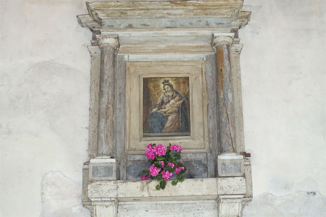 Wir kommen an den Ruinen der rechts von uns liegenden Villa Guarnieri vorbei. Bei der sofort darauffolgenden Weggabelung gehen wir halb rechts, sodass wir rechts an der Kirche vorbeiwandern, auf der ein Engel mit einer Trompete thront. Vor der Casa Rosse macht die asphaltierte Straße, auf der wir inzwischen gehen, eine scharfe Linkskehre, bis sie dann an der Hauptstraße an dem Stoppschild endet. Wir folgen dem Verlauf der Hauptstraße nach links, um diese nach ca. 500 m links in die Einbahnstraße zu verlassen. Vor einem Friseurladen endet die Straße, wir gehen rechts und bei der nächsten Möglichkeit sofort wieder rechts. Abermals gabelt sich dann die Straße, wir gehen nun halb links, wieder in eine Einbahnstraße, die 03 Via Rive Alte (266 m).