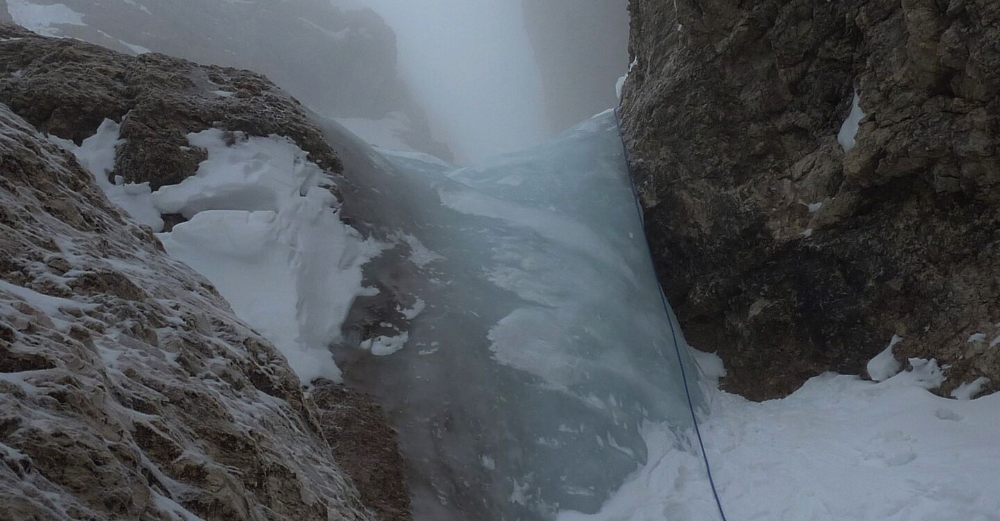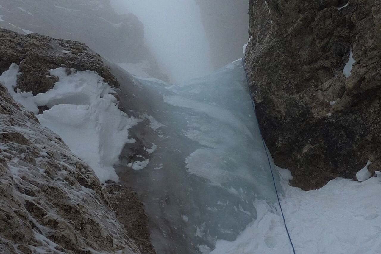 Mein GPS hat in der Scharte versagt. Aber einmal drin, gibt es keinen anderen Weg mehr als hinunter. Die Abfahrt führt über einen Nordhang. Folgende Ausrüstung wird empfohlen: Produkte für alpine Sicherheit im Schnee, Freerideski, Klettergurt mit 20m Kletterseil, Steigeisen und Pickel und Skitourenhelm. Es empfiehlt sich die Einkehr in das Rifugio Maria bei der Bergstation, welches nach Maria Piaz, der Pionierin des Tourismus am Pordoipass, benannt wurde. Beste Jahreszeit: Januar bis April. Uns erwarten kurze Stücke mit bis zu 50° Hangneigung.